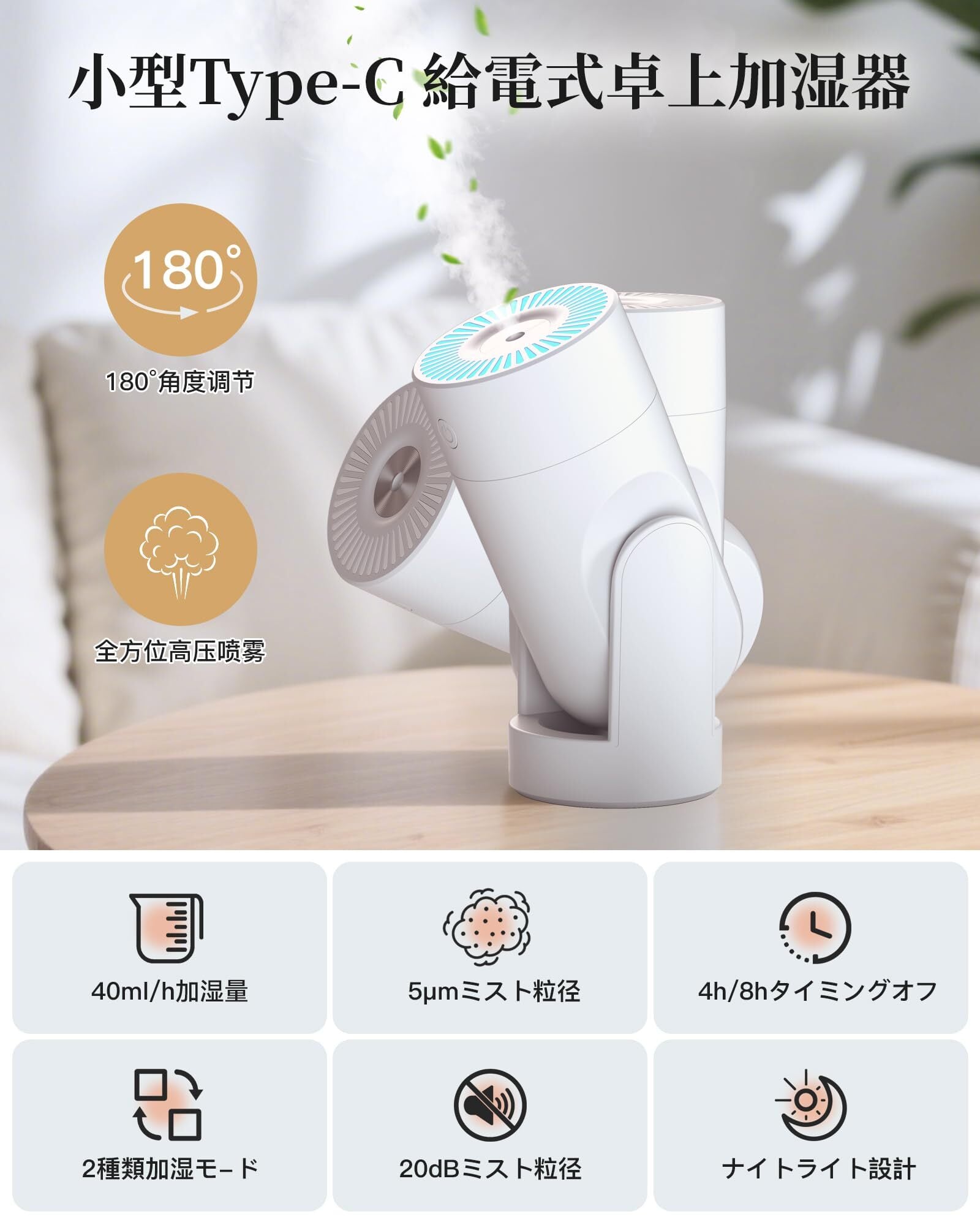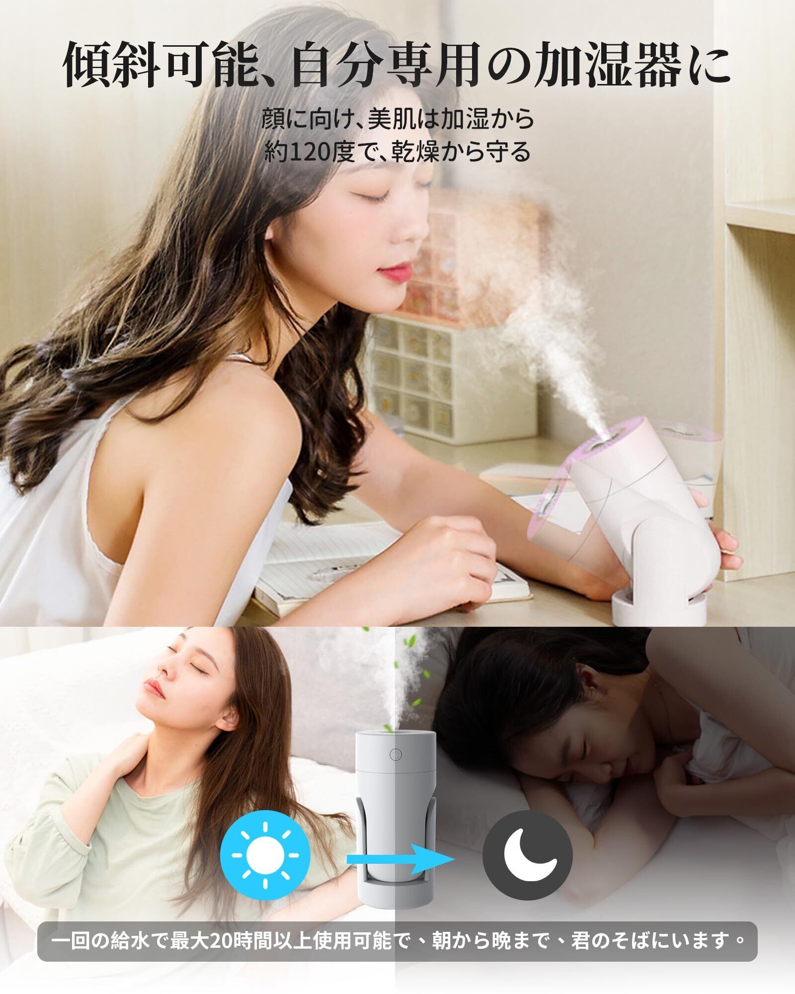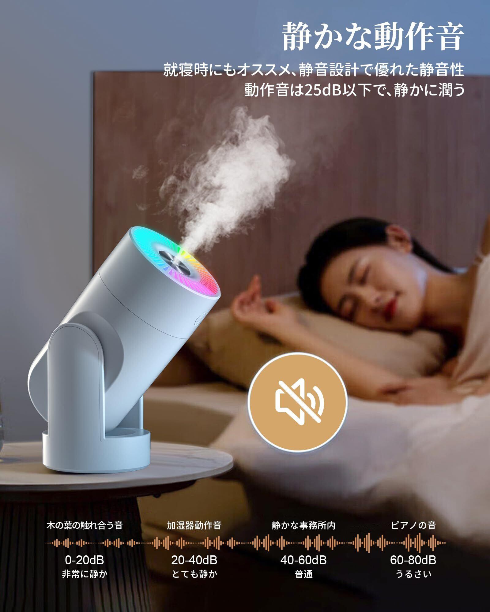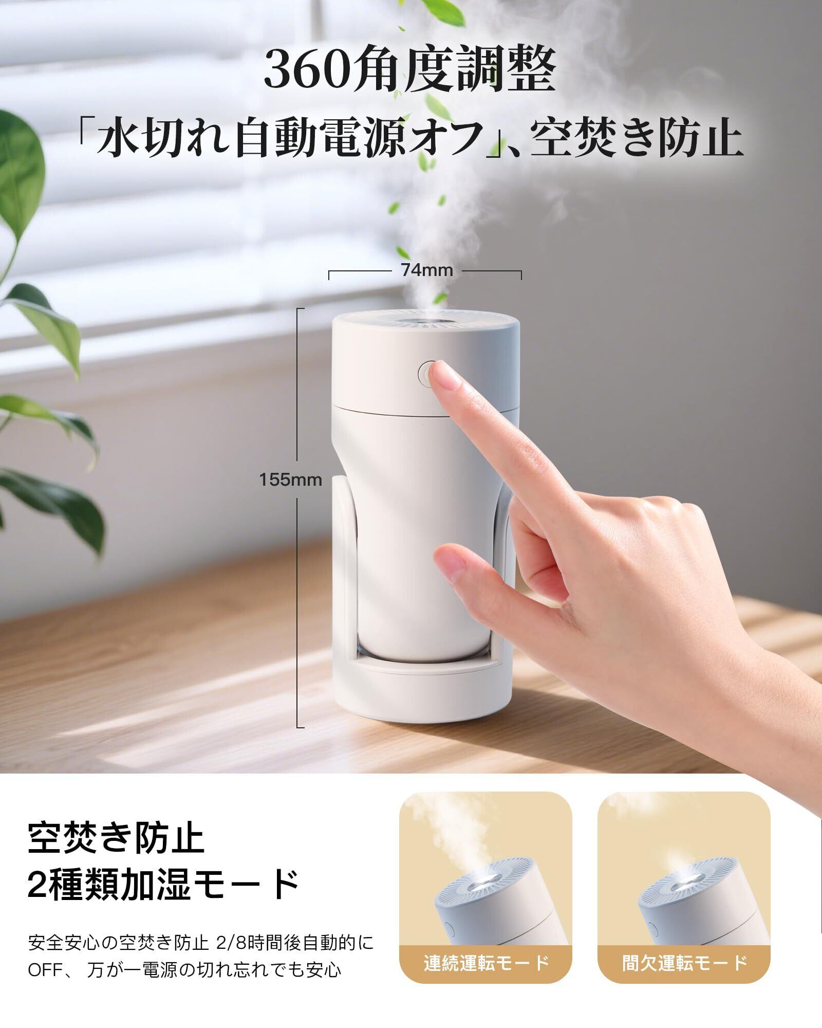 【新登場 加湿器 小型&角度調整可能】卓上加湿器は角度調整可能で、ユーザーは湿度を必要な方向に向けて調整でき、加湿器 小型の水滴が効果的に部屋内に均等に広がります。お好みに応じて加湿器の加湿方向を調整でき、お部屋全体に快適な湿度環境を提供します。さらに、角度調整可能な加湿器は、湿度管理に柔軟性をもたらし、ユーザーに快適な室内環境をカスタマイズする機会を提供いたします。