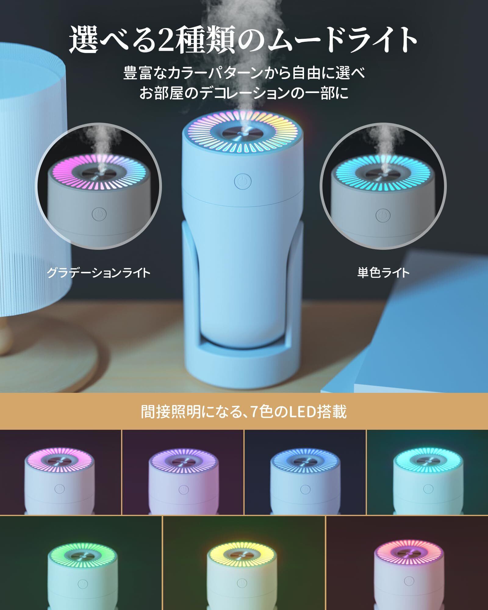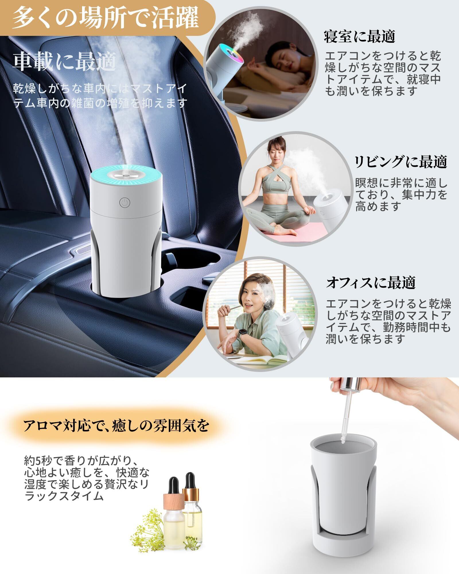【ナイトライト アロマ対応&パーソナライゼーション】小型加湿器は七色のLEDライトがあり、単色固定またはカラーサイクルモードを選択できます。加湿器のライトが夜間の睡眠の妨げになる場合は、ライトをオフにして加湿機能を楽しむこともできます。お好きなエッセンシャルオイルを入ればフレグランスも楽しめます。気分に合わせて好きなライトやエッセンシャルオイルを使い、最も快適な雰囲気を作り出す。車用加湿器のタンクに水を満たした後にエッセンスを少量「1~3滴で十分」加えてください。アロマウォーターの使用をお勧めします。アロマオイルはこの超音波式加湿器の霧化機能に影響を与えてしまう為、使用しないでください。
