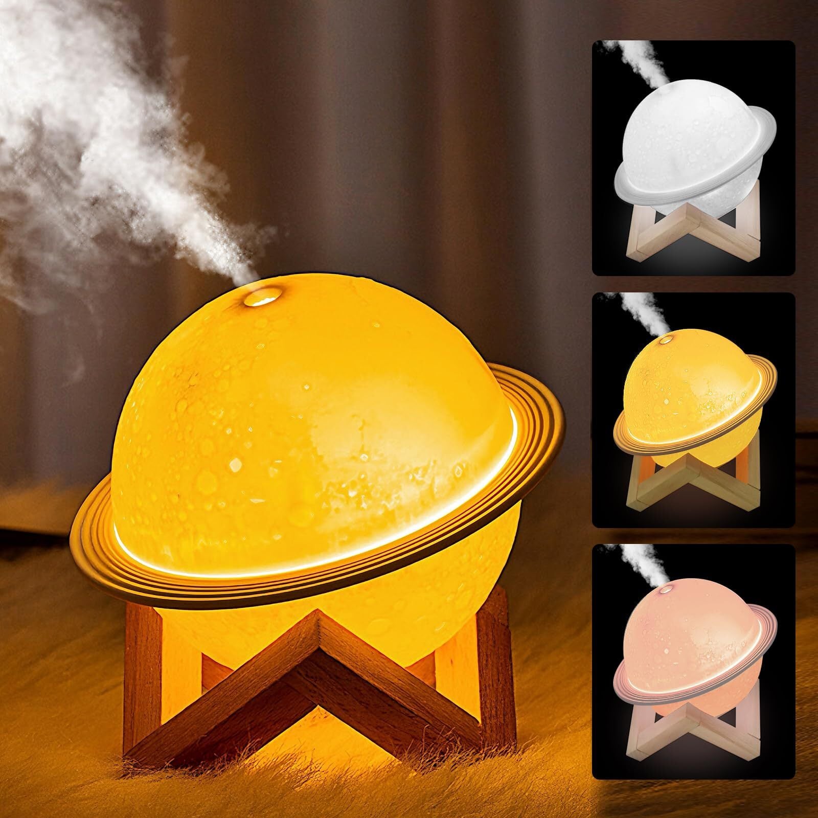 【三色の惑星ランプ加湿器】惑星ランプ加湿器は白色、電球色、昼白色の三色のLEDムードライト付きで、ボタンを長押すとライトの起動とオフができます。惑星の表面は3D印刷技術を採用して、惑星の淡い縞模様・巨大な環・山脈・谷の凹凸感を再現してくれます。加湿しない時も点灯可能です。心地よい惑星の明かりで夜を照らし、温かい雰囲気創り出します。