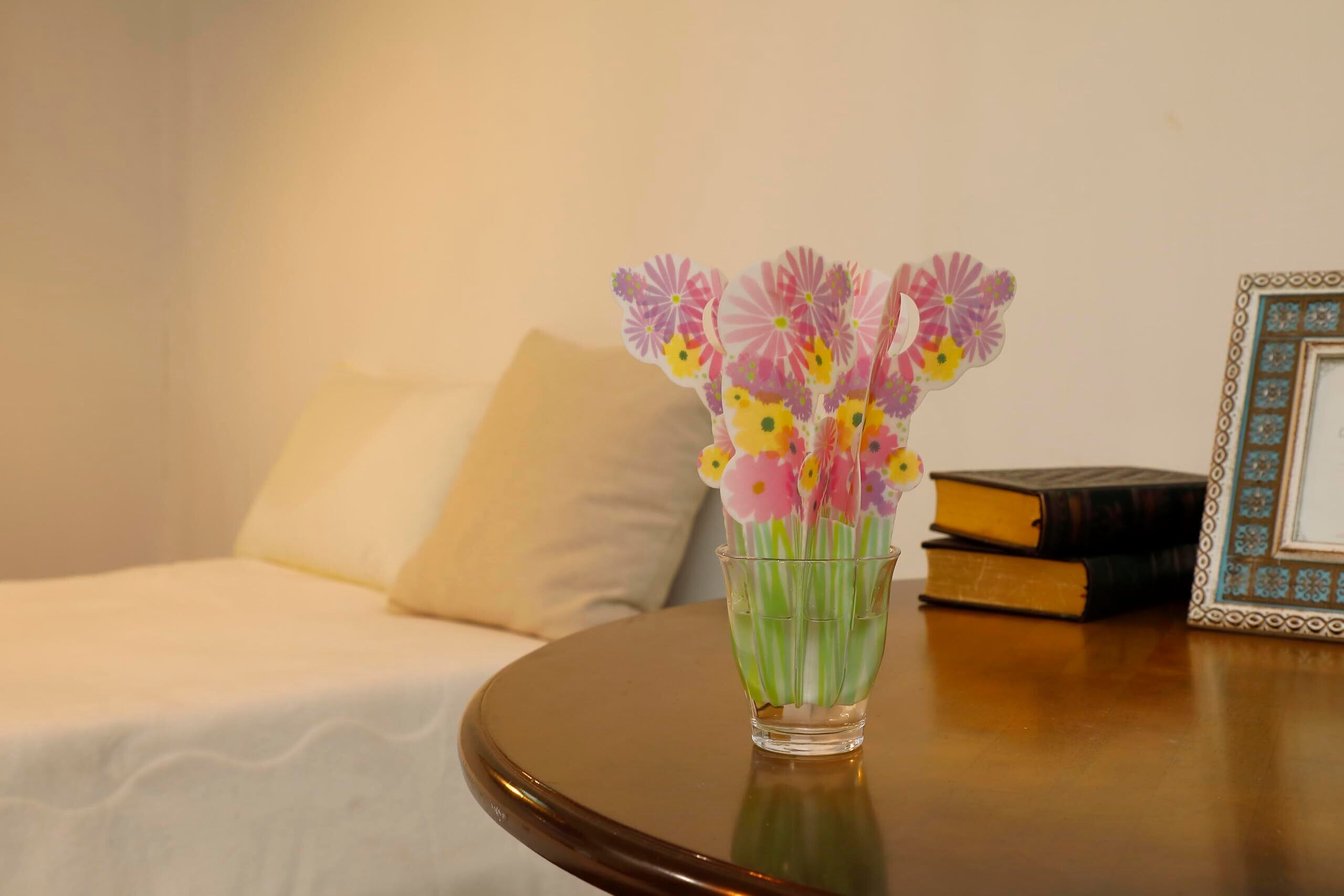 何処でも使える、電気のいらない加湿器マーガレットなどをモチーフに描いた花柄は、リアルな色ではなくピンク系とブルー系の水彩画タッチで透け感のあるデザイン。茎の部分は変則的なストライプで水に浸かっているイメージを表現しました。ウイルス予防、冬の乾燥対策に向けた加湿アシスト! 電気を使わないeco仕様で、加湿能力はコップ約10杯分! お部屋のインテリアとして飾れるアート感覚の加湿器!