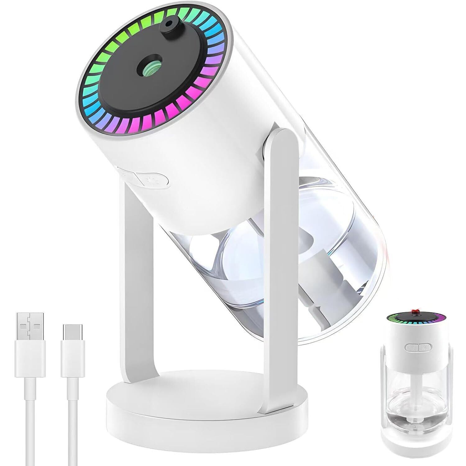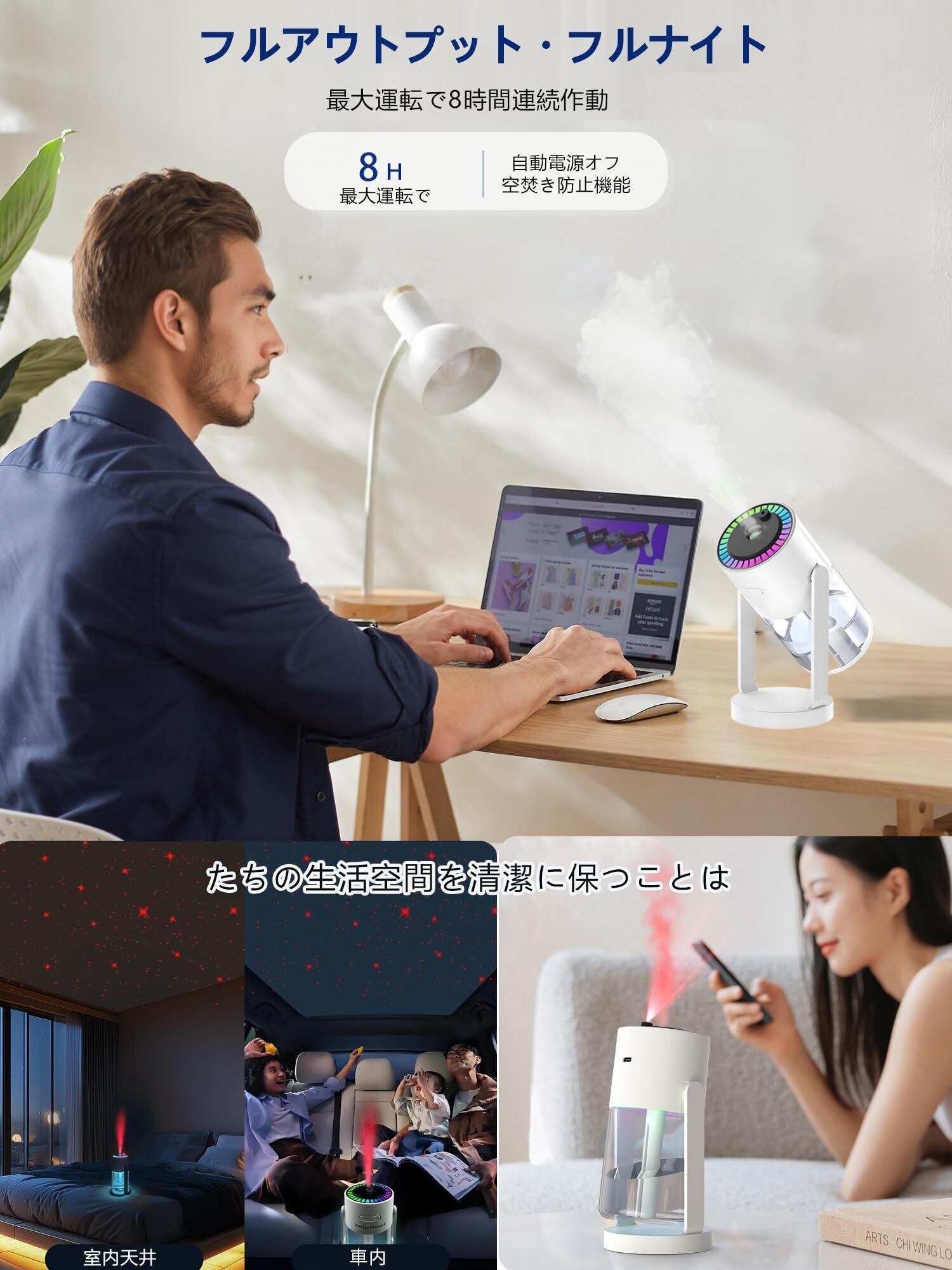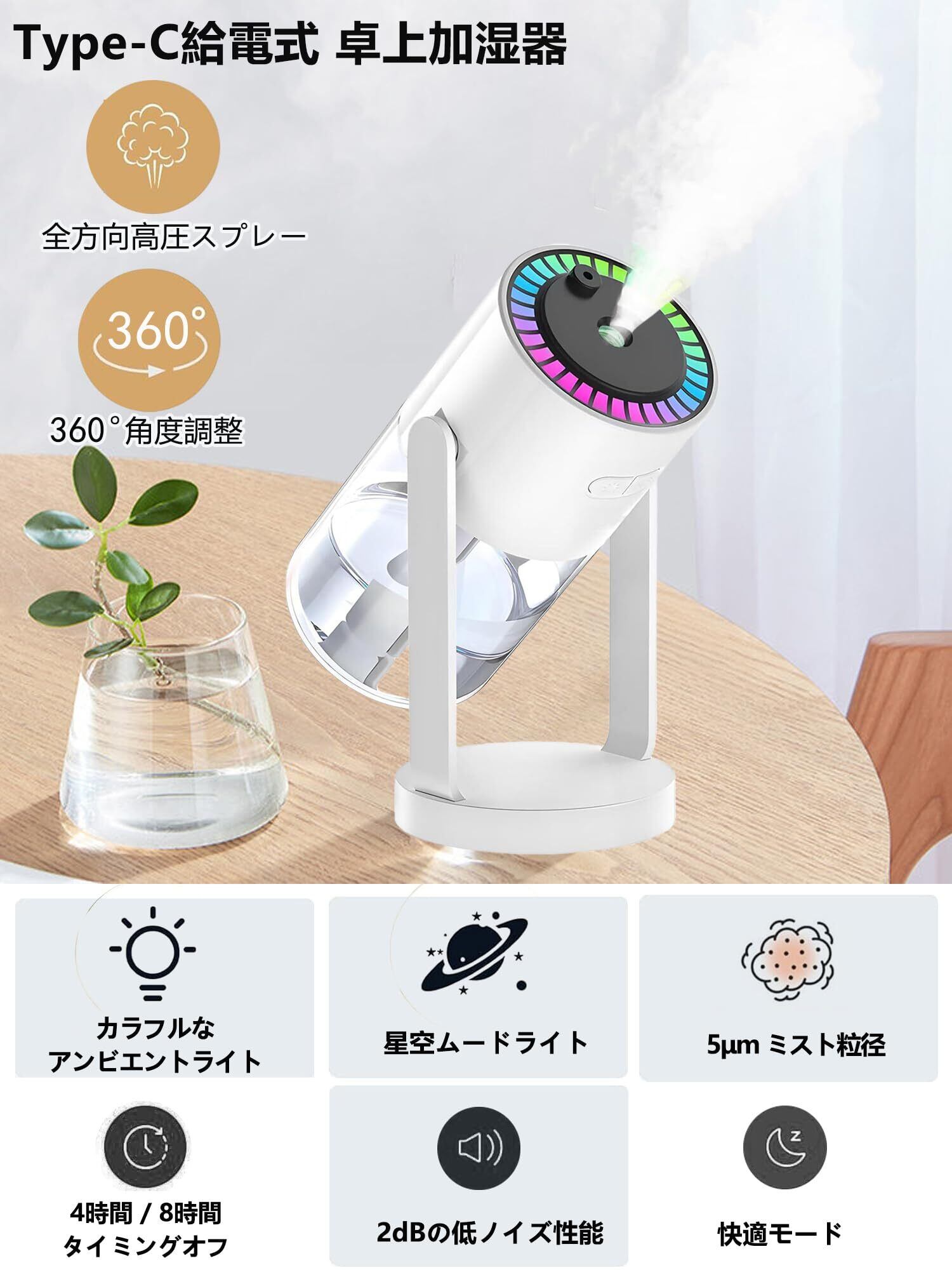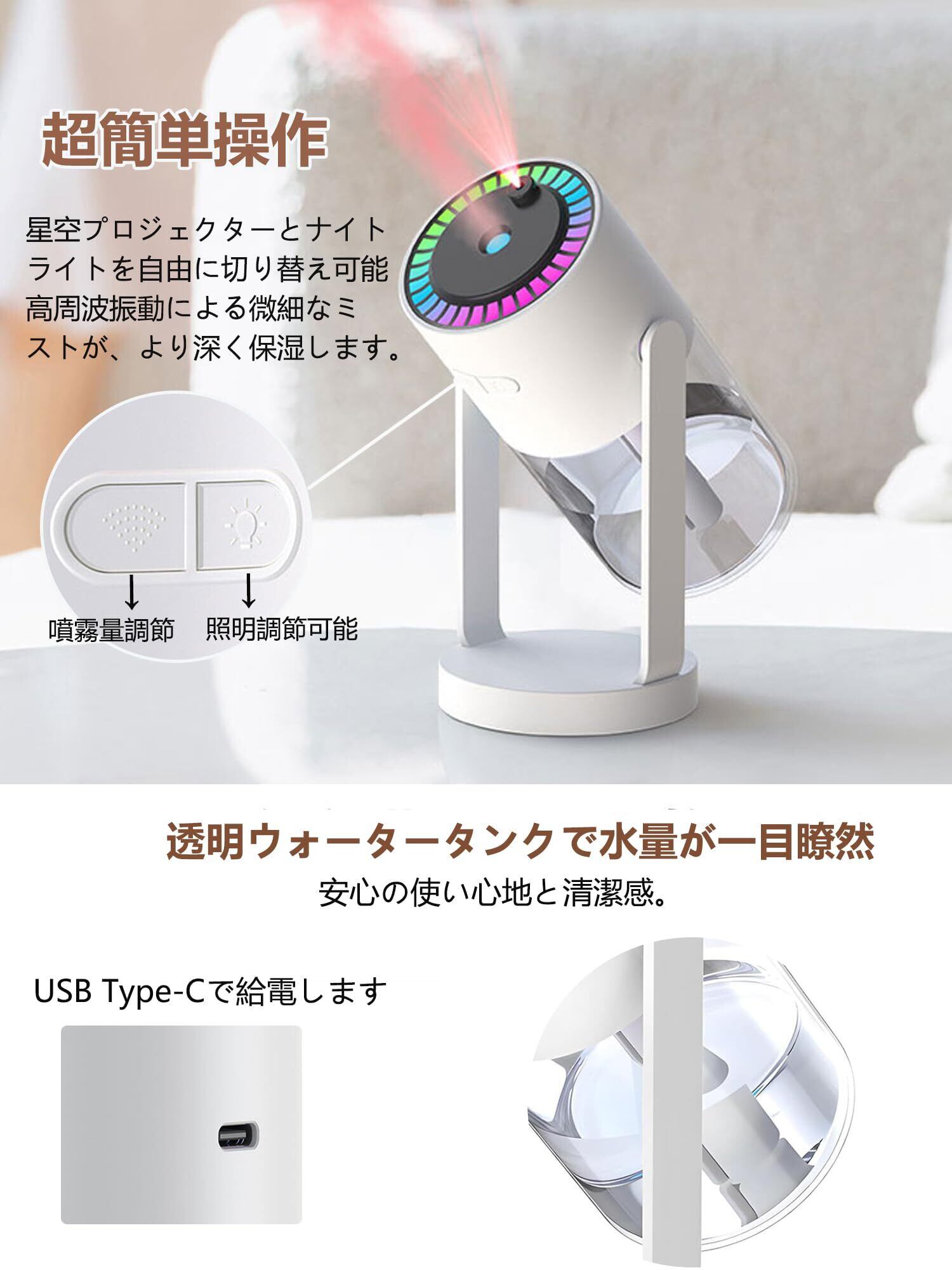 加湿器 卓上 超音波 星空ライト 大容量 小型 7色LEDライト 次亜塩素酸水対応 空焚き防止 水漏れ防止 静音 省エネ 保湿 乾燥対策 持ち運び便利 吹出し口360°回転 280ml 長時間 寝室 車用 お手入れ簡単 携帯加湿器 (ホワイト)