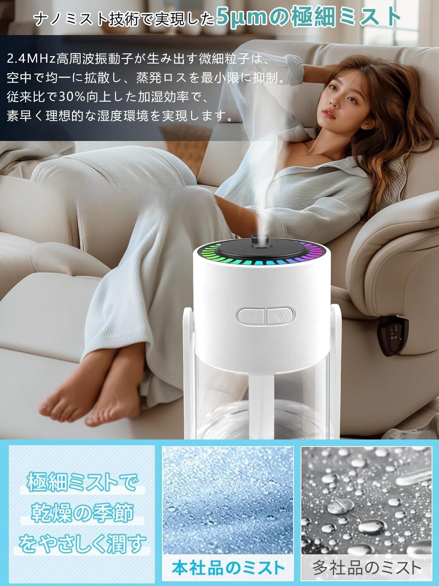 【高分子霧化技術で潤いなミスト】この加湿器は高分子霧化技術で細かいミストで優しく潤いつつ、お部屋の湿度を適切に保ってくれます。ミクロの霧を吹き出し、細かいミストで肌奥まで補水、お肌の乾燥を防ぎ、加湿の同時に、リラックスな雰囲気を作り出す。毎日、心穏やかの生活に不可欠な一品です!
