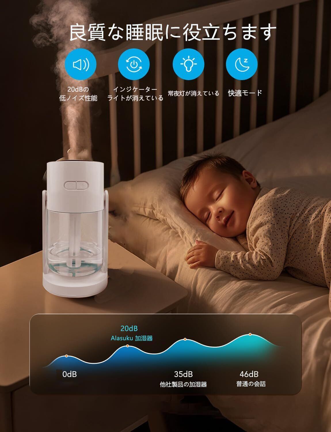 【2種類噴霧パターン&静音運転】 この卓上加湿器は加湿モードに調節できるため、部屋の湿度状況、ご使用の場面に応じて調整してください 連続モードなら4時間 断続モードなら8時間 噴霧タンクの水が足りなくなると運転を自動停止します。動作音≤30dB!図書館よりも静かで、周りの湿度を保ちながら、仕事や睡眠の邪魔にならない卓上加湿器 です。