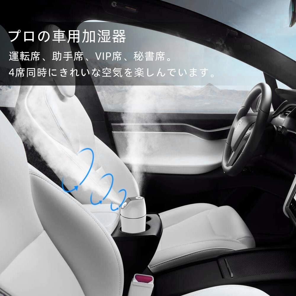 ●【車載用でもOK】 従来のシングルノズル加湿器は、車の前部座席のカップホルダーに取り付けられ、前部座席の空気を改善するだけです。。しかし、ダブルノズル加湿器は違40度の角度のスプレーノズルが付きなので、運転するときに、負の酸素イオンと混合した大量のミストが後部座席に吹き付けられます。後列の乗客も、清潔で湿度の高い空気環境を感じられます。車内のほこりと静電気を防ぎます。もちろん旅行、ビジネスの場合にもおすすめです。