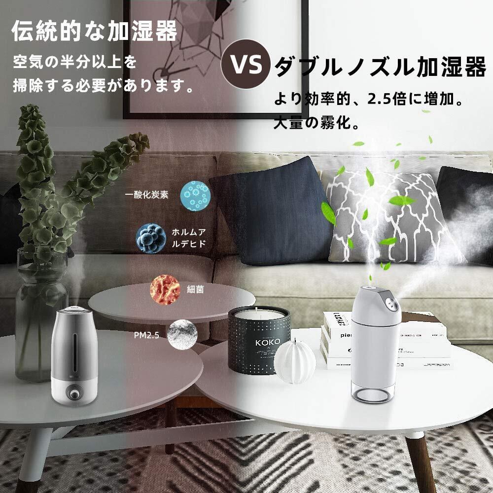 ●【ユニークなダブルノズル設計——超大加湿量・次亜塩素酸水対応】45°と90°のノズル付きなので、ただの加湿器だけではなく、顔の水分補給にもぴったりです。113KHz超音波アトマイザーが2つ付き、運転効率は従来のシングルノズル加湿器より250%アップ!最大加湿量はは140mL / Hです。市販の単一ノズル加湿器がただ40〜60mL / Hです。ダブルノズル加湿器が運転する時、豊富なマイナス酸素イオンを生成し、バクテリア、ホルムアルデヒド、および一酸化炭素を除去します。加湿器を使って湿度を維持することで、乾燥による喉・肌・目の不調や、ウイルスの活性化を防ぎます。テーブルに置くだけで、すぐ使える便利なグッズです。お客様におすすめです。次亜塩素酸水対応の加湿器ので、次亜塩素酸水を少し入れても問題なく使用可能だが、日本の使用基準を参考して入れるほうがおススメです。