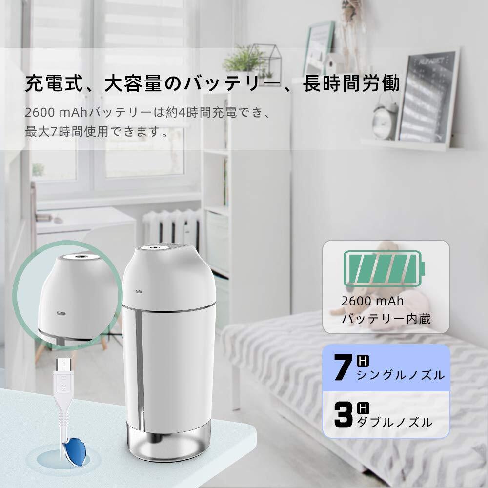 ●【大容量電池内蔵・4段階調整】2600 mAhの大容量電池内蔵、最大使用持続時間が7時間です。そして、お客様にこの加湿器を満喫させるため80CMの USB充電ケーブルも付き。加湿器には4つのモードがあります❶シングルノズル作業モード、❷デュアルノズル代替作業モード、❸デュアルノズル一緒に作業モード、❹夜間照明モード。使用時、60mL〜140mLのスプレー量は環境に応じて自由に調整できます。PCBAボードにはセキュリティ保護が備わっています。デュアルノズルが機能している場合、3時間後に自動的にオフになります。シングルノズルが動作している場合、6時間後に自動的にオフになります。