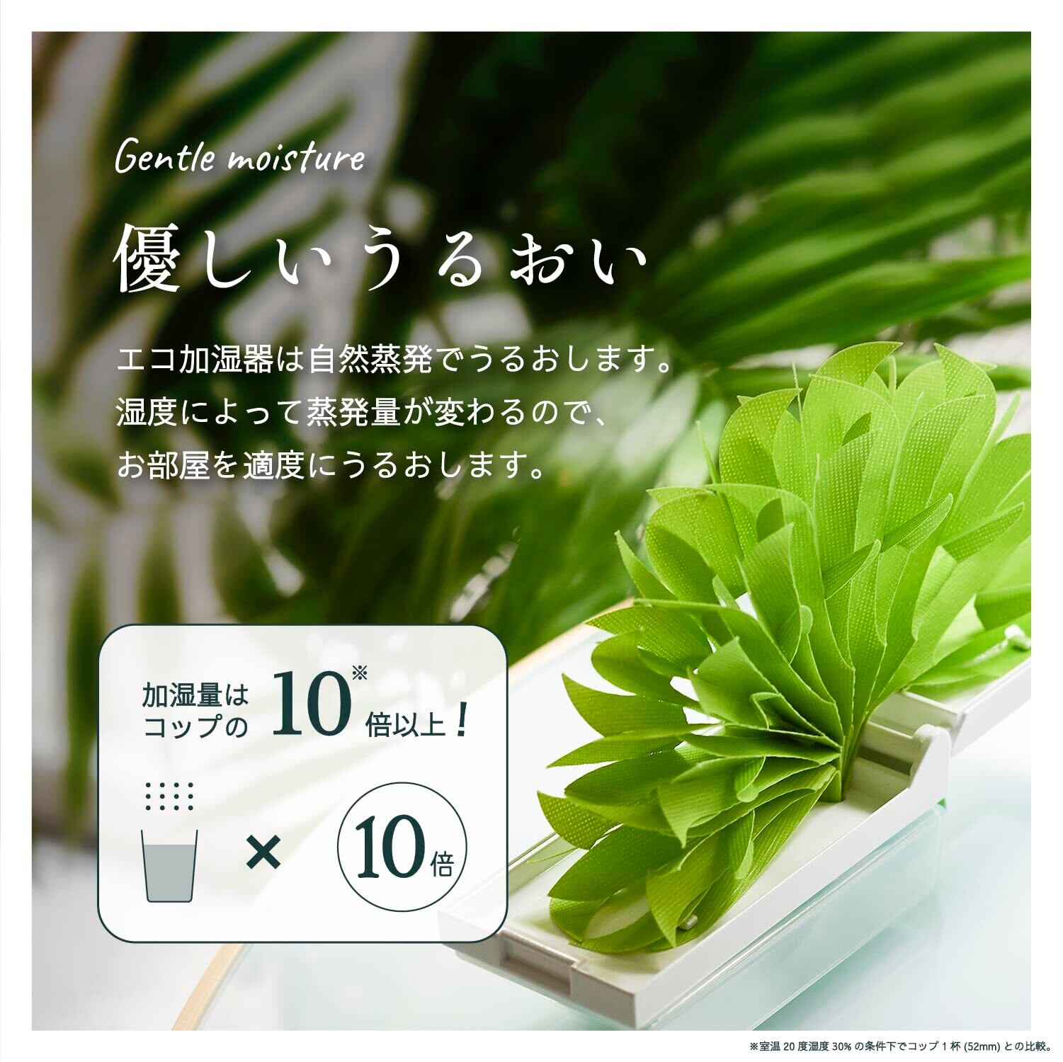 タンクに水を注ぐだけの電気を使用しない自然気化式のエコ加湿器。オアシスプラスがよりコンパクトにより快適になってリニューアルしました。抗菌・防カビのフィルター使用しています。加湿量(=自然蒸発量)はコップ1杯の自然蒸発量の10倍以上※室温20度湿度30%の条件下にて、コップ1杯との比較。