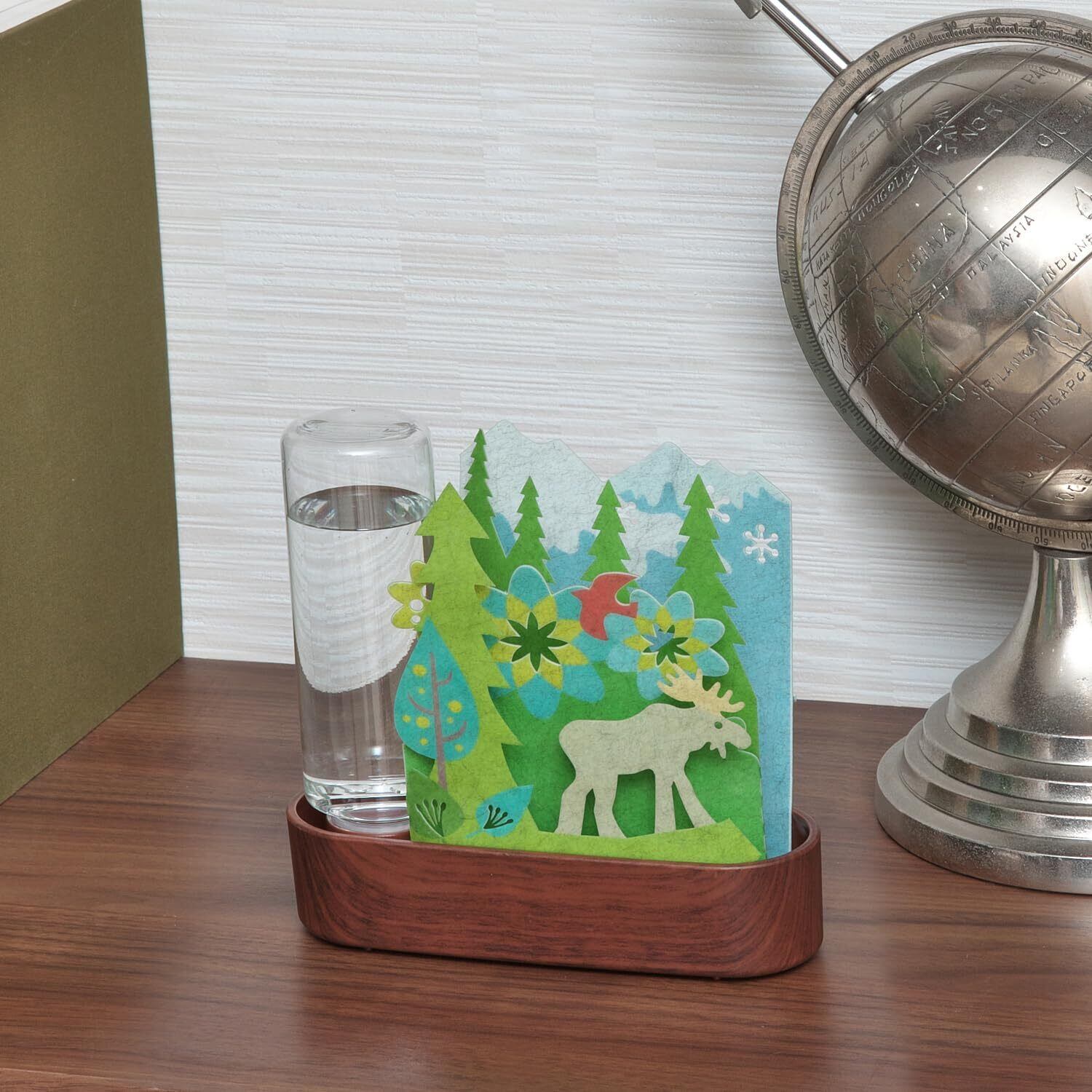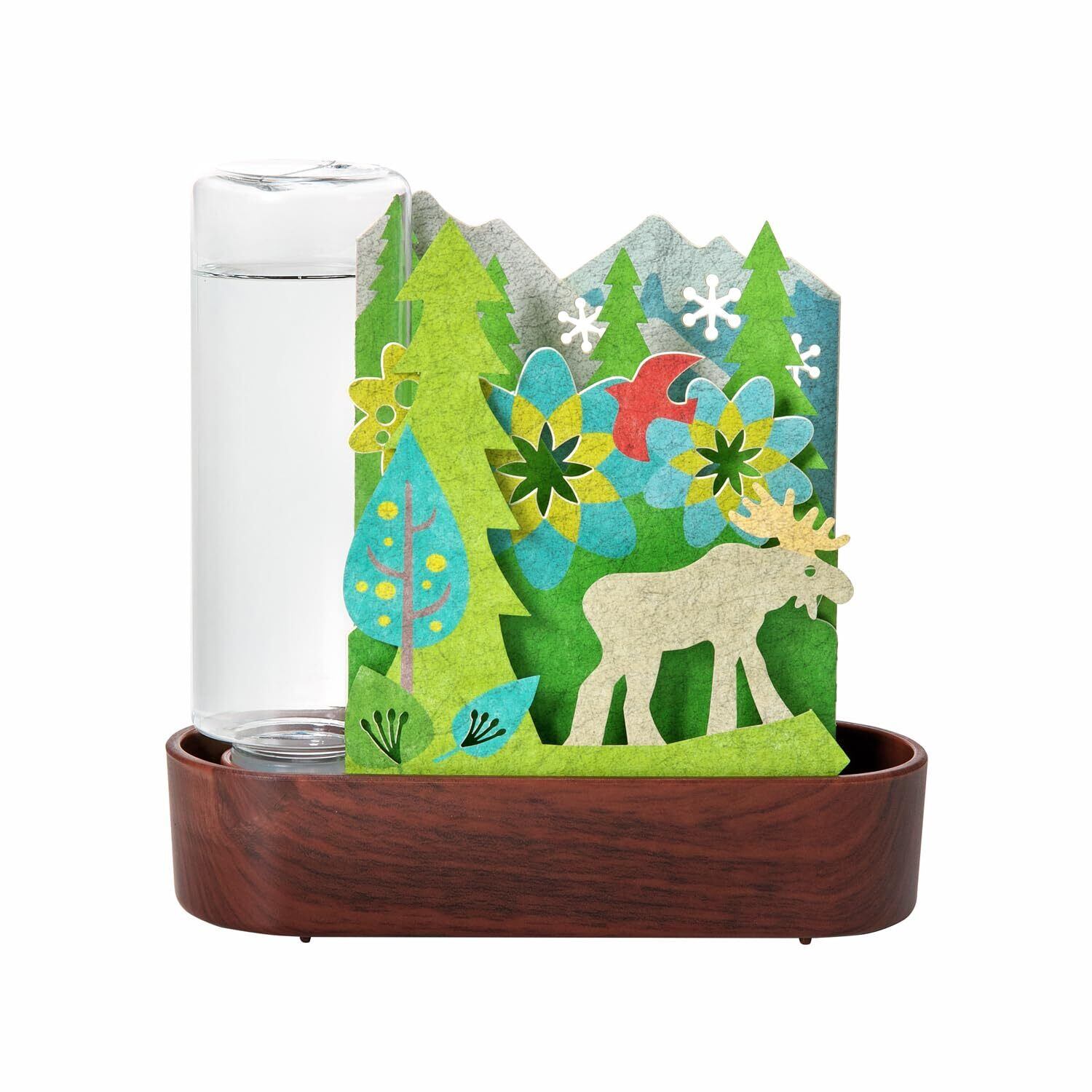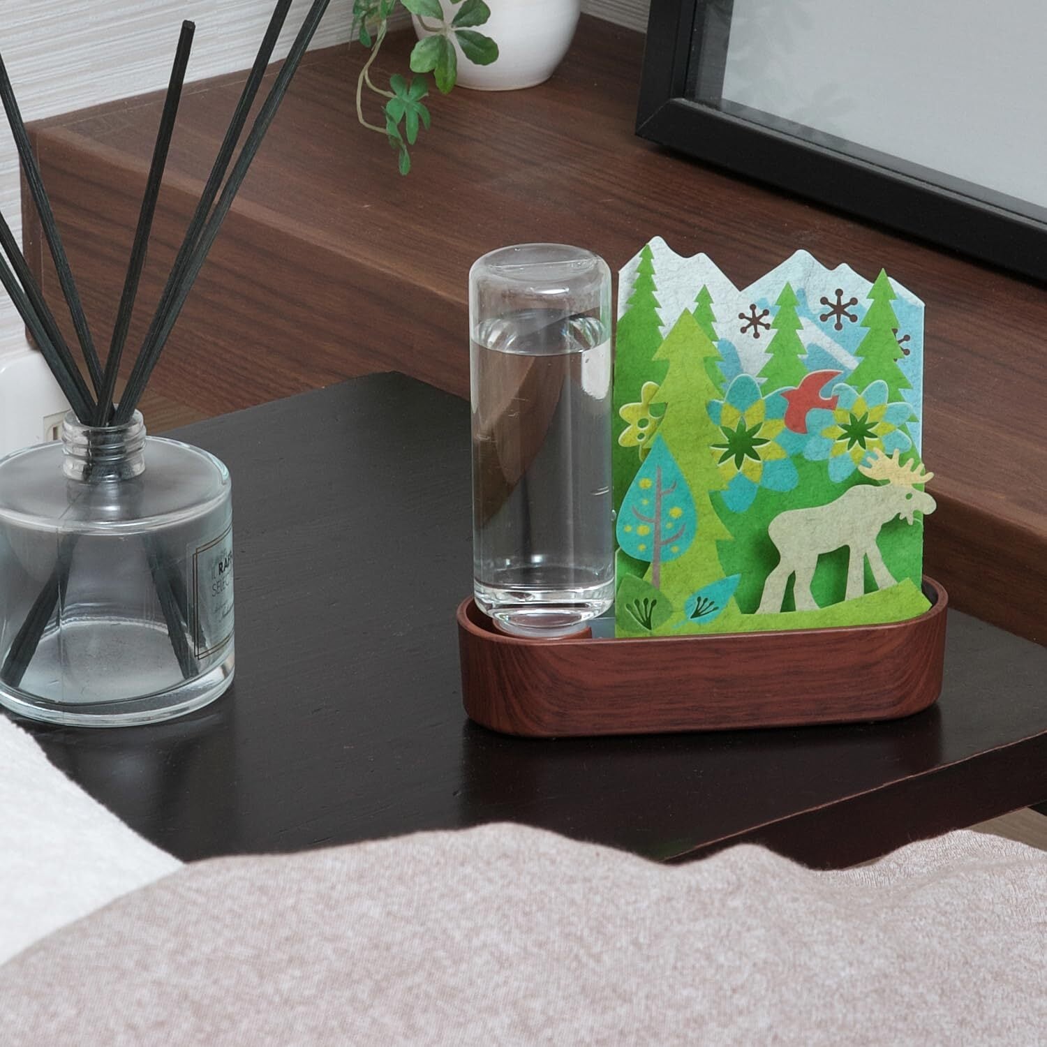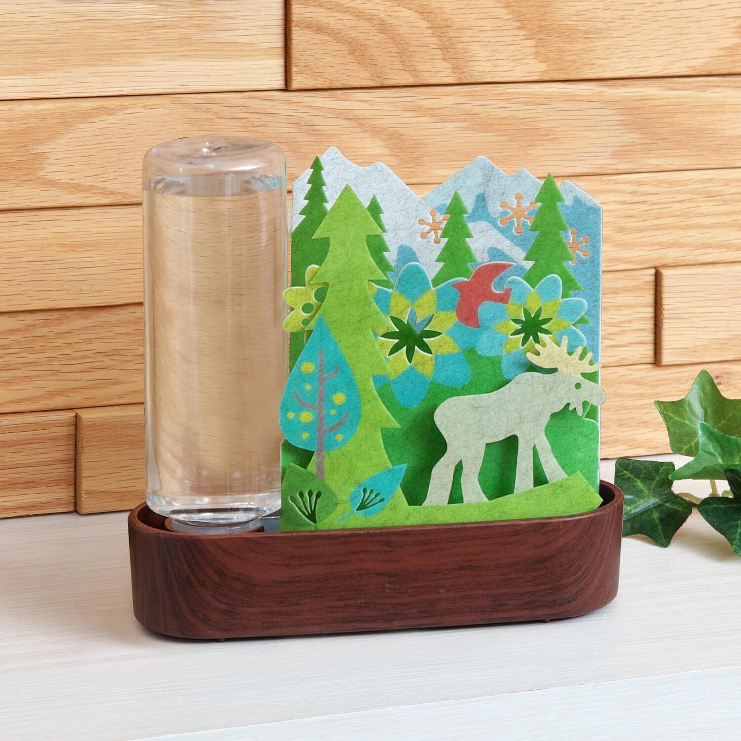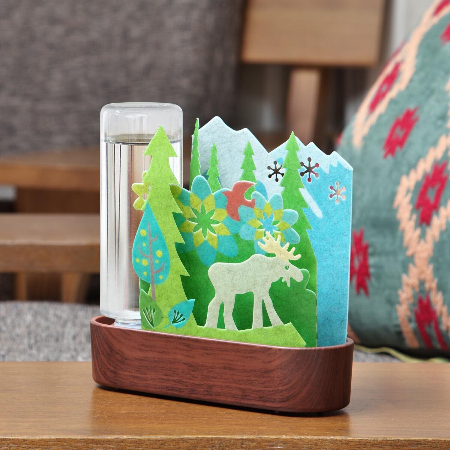 電気を使わない自然気化式加湿器。加湿能力はコップ1杯(径52mm)の自然蒸発量の約10倍(温度25℃・湿度35%時の蒸発量)※当社試験による。給水ボトル付なので水の供給時間を長くする事ができます。デザインは北欧に春の訪れをイメージさせる山々とエルクとのコラボレーション。(材質)フィルタ-:紙、ボトル:PET樹脂(容量150ml)、トレイ:ABS樹脂、キャップ:PP樹脂。
