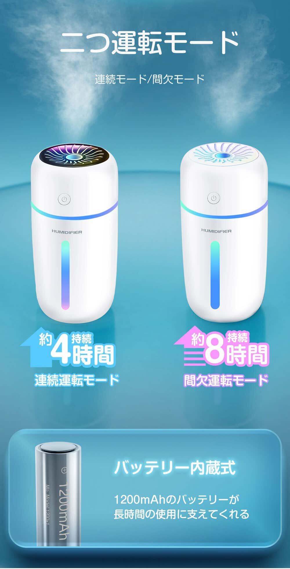 【充電式&最大12時間使用】卓上加湿器 充電式 超音波式 車用加湿器 アロマ 次亜塩素酸水対応 静音 大容量 350MLコードレス 連続/間欠運転 最大12時間加湿 除菌 加湿器 持ち運び便利 七色LEDライト 小型 空気浄化機コードレス オフィス 子供部屋 部屋 車載 乾燥/花粉症対策 空焚き防止 (ホワイト)