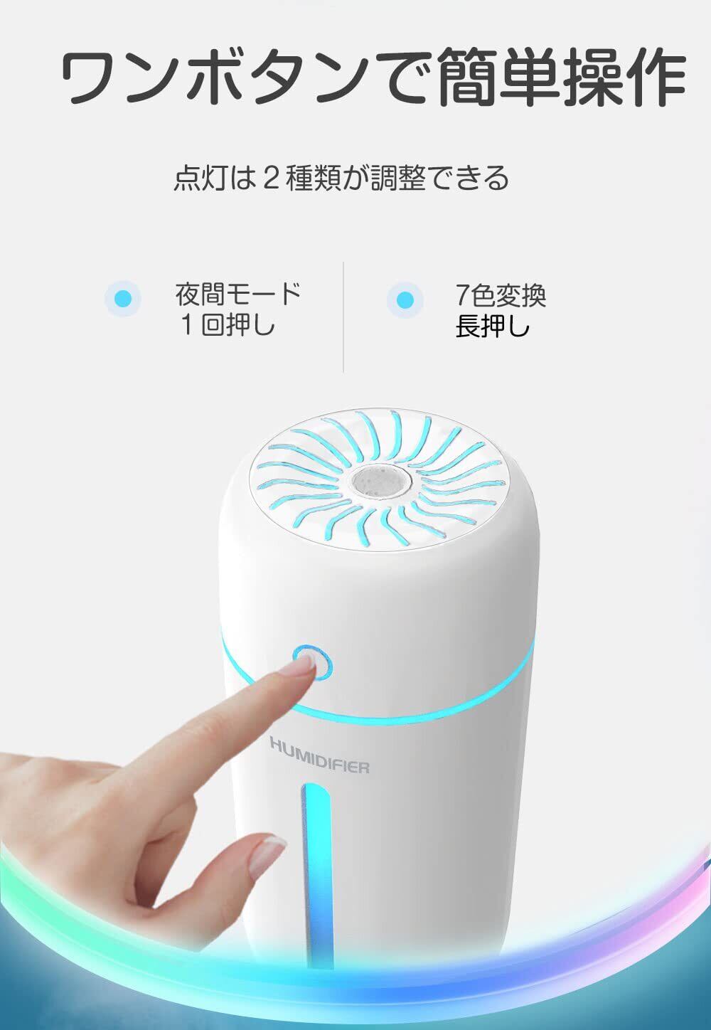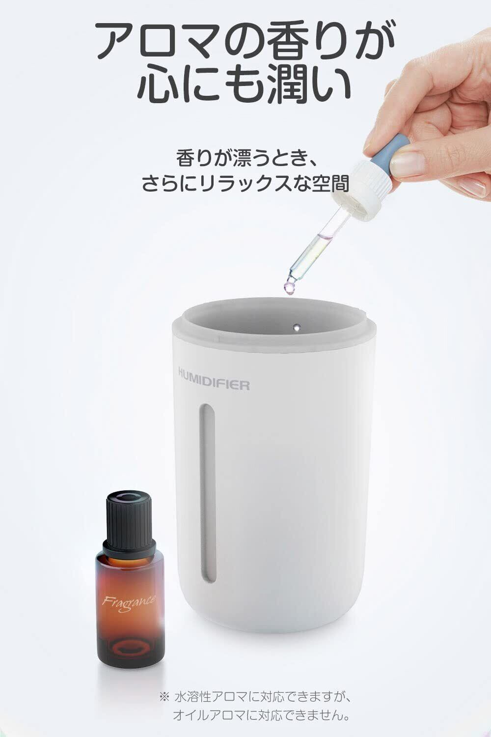 【長時間連続使用&3種類点灯モード】充電式なので、コンセントがない場所でも手軽に使用可能。バッテリーはUSBで充電できる1200mAhの高性能リチウムイオン電池を採用、1回のフル充電で最大約8時間連続使えます。注:使用時間は使用方式により差が生じることがございます。いつでもどこでもサッと使えます。本体もコンパクトで、持ち運びにもおすすめです。心地よい香りと幻想的な光で、リビングやベッドルーム、オフィス空間で、最高の癒しを演出してくれるモデルです。多色変換の光でリラックスした雰囲気を醸し出してくれるアロマライトを搭載しています。コンパクトとおしゃれを両立した実用的な卓上加湿器です。
