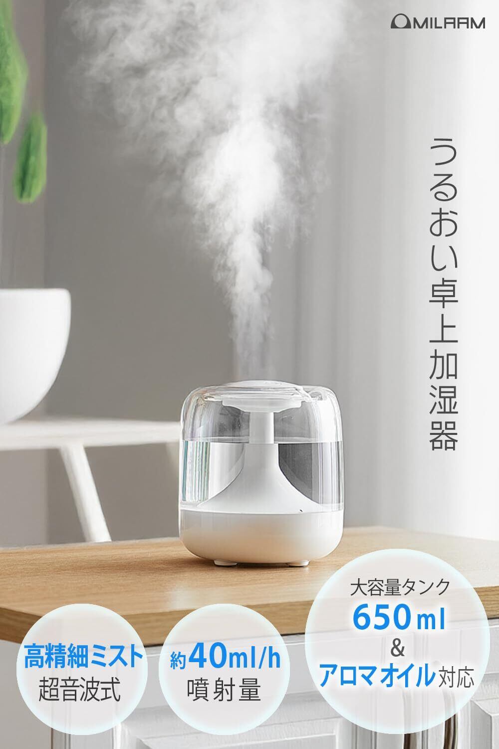 MILAAM 卓上 加湿器 小型 大容量650ml 超音波式 高精細ミスト 噴射量40ml/h 2つの噴射モード 連続8時間自動OFF アロマ対応 空間演出LED照明 USB Type-C 静音設計 デスク 寝室 おしゃれ