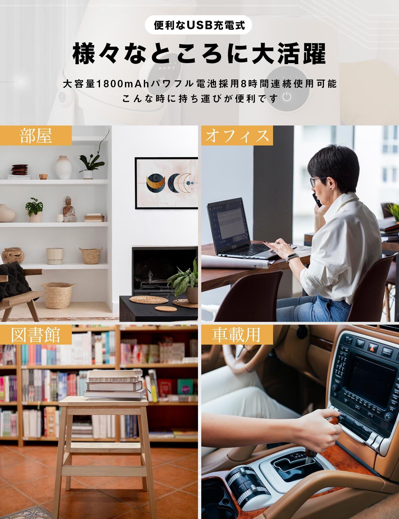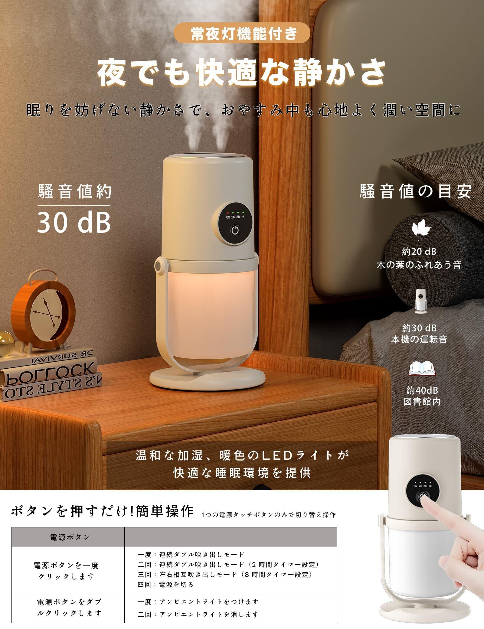 【超静音&持ち運びに便利&3階段加湿モード】かしつきの動作音は25dB以下、とても静かで図書館よりも静かで、周りの湿度を保ちながら、仕事や睡眠の邪魔にならない卓上加湿器 です。Type-C充電式はコンピューターやモバイルバッテリーなどから電源を取れて、軽量かつパーソナルサイズで、オフィス、書斎などの卓上に、寝室のベッドサイドに、車内にも適します。どこでも使えるし、携帯には便利です。連続/2時間/8時間・3種モードがあり、加湿量調整可能です。1回のフル充電で最大8時間(コードレス)使用できます。加湿器をスタンドに固定し、360度回転させることができます。製品包装内容:本製品、Type - C USB 充電ケーブル、英語製品説明書、綿棒。
