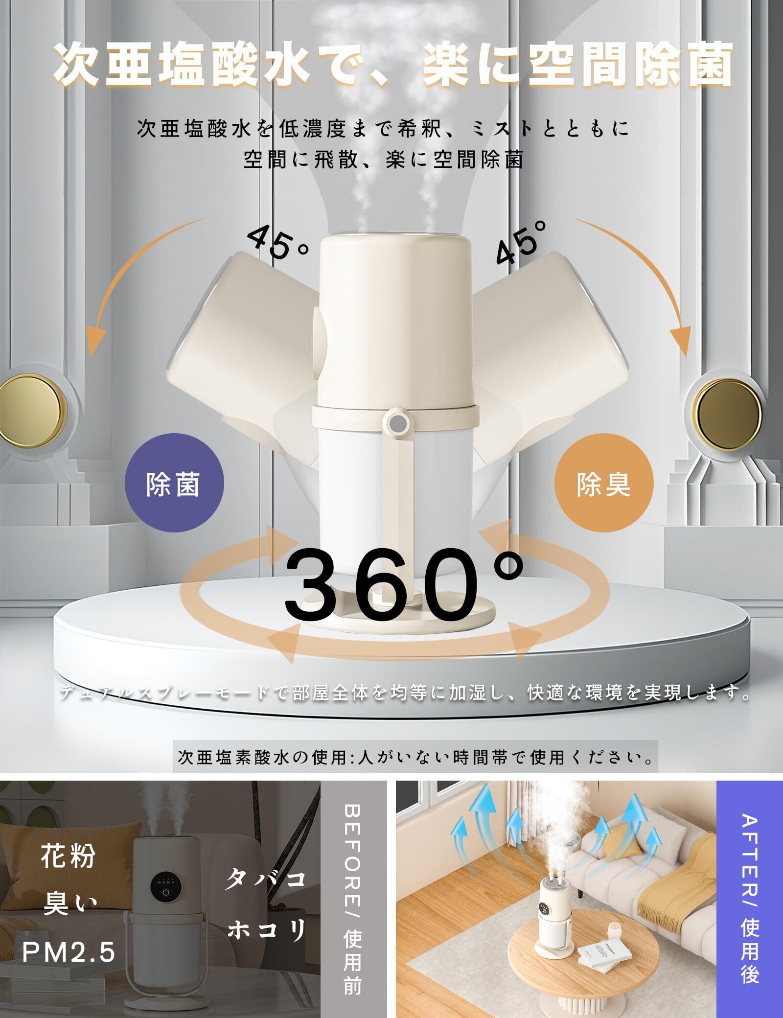 【上下180°角度調整可能 ダブルノズル加湿器】この卓上加湿器は上下180°の角度調整が可能です。加湿範囲に制限がないため、便利に使用できます。お好みに合わせて加湿の方向を調整し、お客様に快適な室内環境をカスタマイズする機会を提供いたします。密閉設計なので、角度調整しても水漏れの心配はありません。ダブルノズルが搭載されており、より効率的に加湿が行えます。さらに、「連続噴霧モード」、「交互噴霧モード」の2つの運転モードが付いており、お好みのパターンを選んで水分を楽しむことができます。