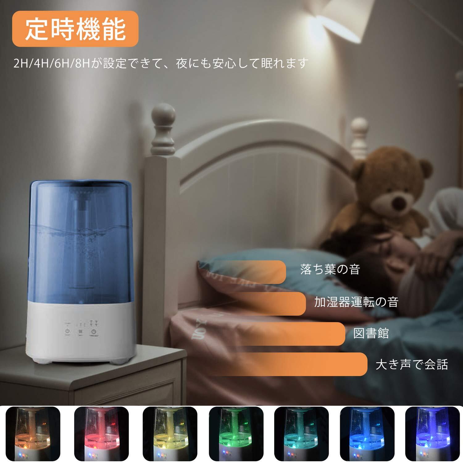 【静音・タイマー機能・空焚き防止】低騒音作業で睡眠を邪魔される心配もなくベッドルームにも気軽に利用できます。2H、4H、6H、8Hのタイマー設定は必要な時間だけしっかり加湿し、睡眠中やお出かけ中にも大活躍できます。空焚き防止機能付きます。水がなくなると電源は自動的にオフになり、空焚きは絶対しません。