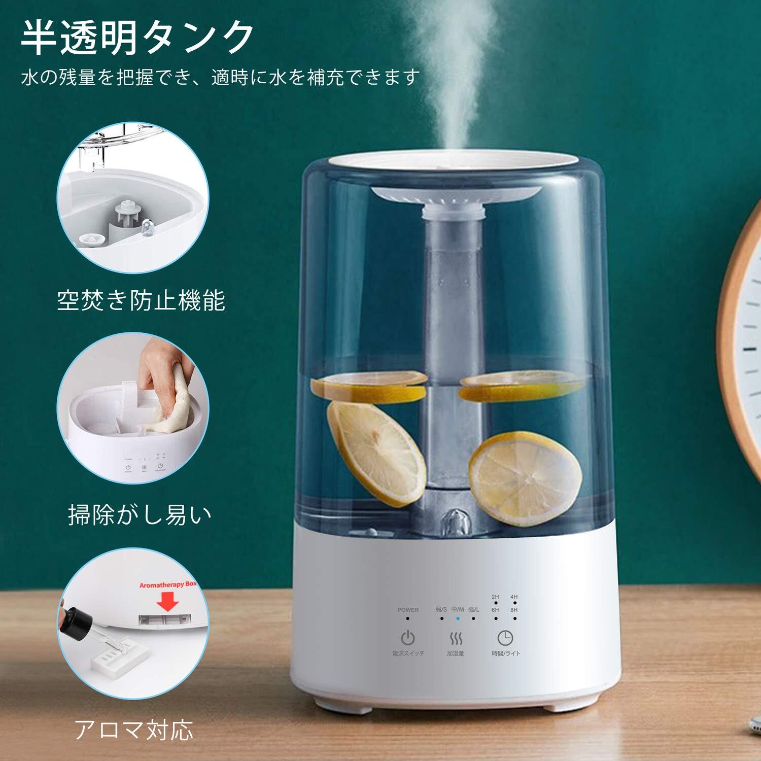 【超音波式加湿器・乾燥対策】超音波式加湿器は自然に快適な湿気を生成します。霧化すると、多くのマイナスイオンを放出し、ホルムアルデヒド、無菌一酸化炭素、細菌などの有害物質を除去します。秋冬に乾燥したお部屋を長く潤うだけではなく、お肌の乾燥対策・インフルエンザ対策・花粉症対策などにも欠かせないアイテム。