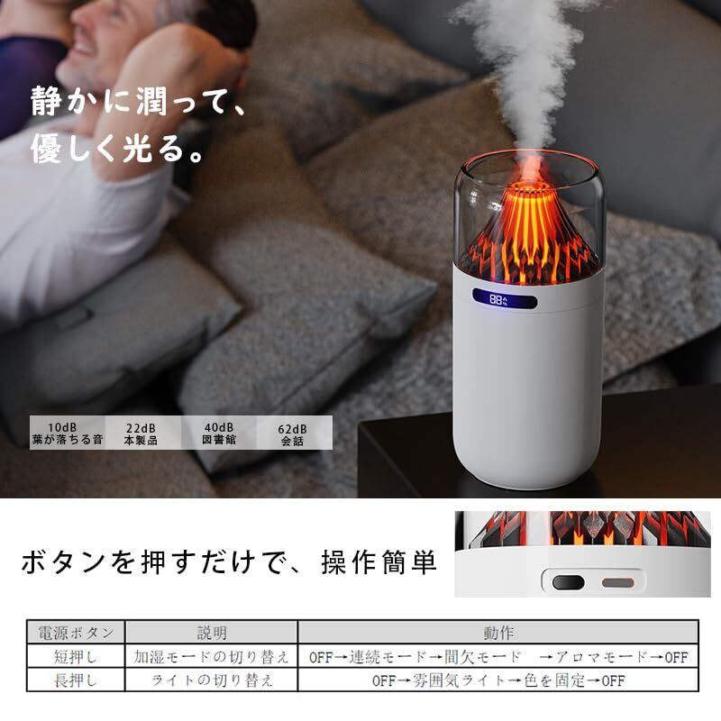 【超音波式卓上加湿器&アロマ機能】: 静音で効率的に空気湿度を上げる超音波式加湿器であり、水溶性アロマオイルにも対応し、香りと湿度の両方を提供します。