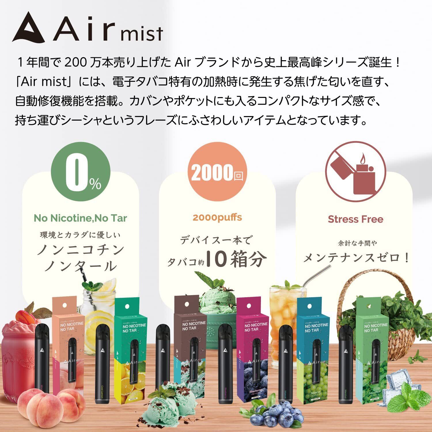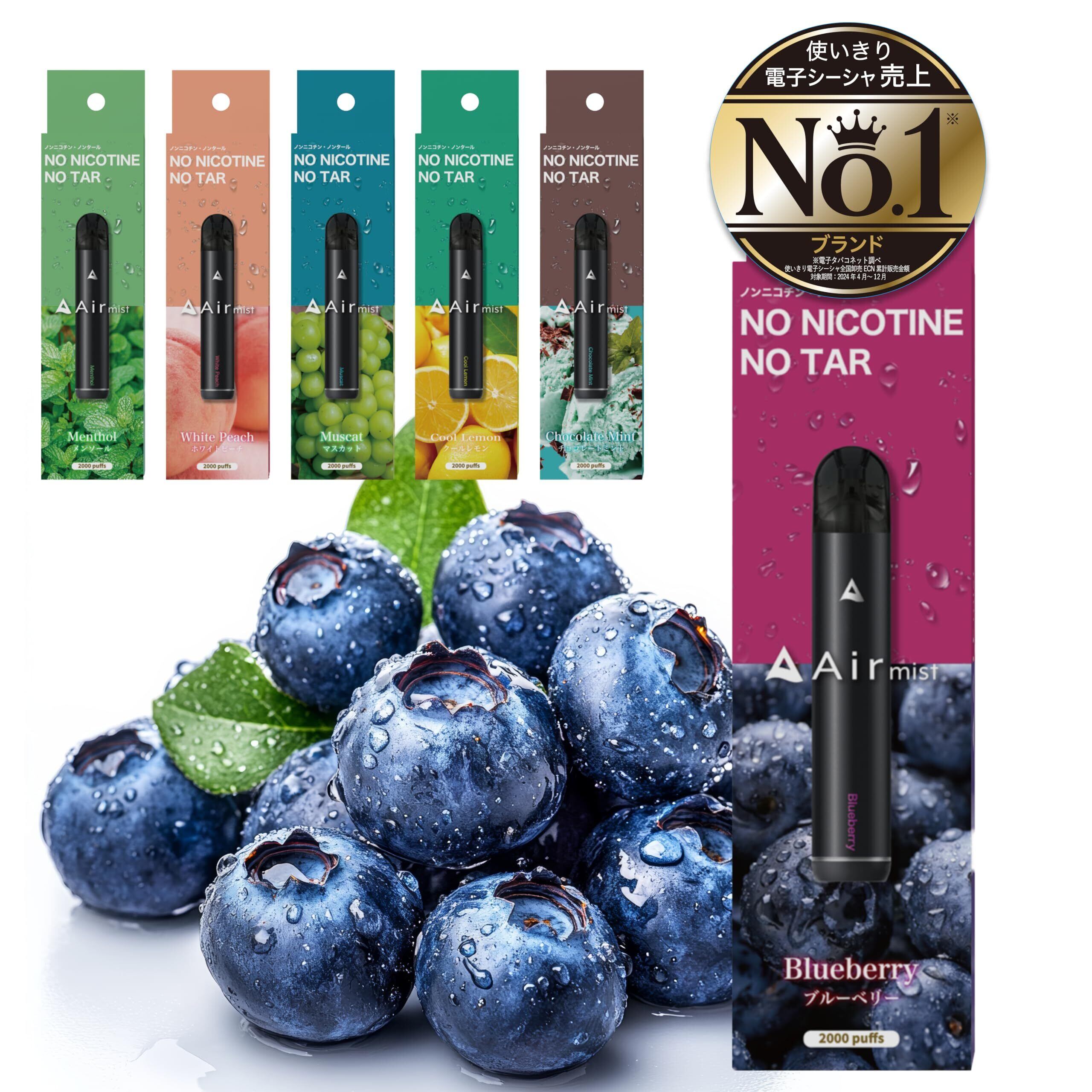 【公式】 全6フレーバー Air mist 約2,000パフ エアーミスト べイプ 持ち運び シーシャ ポケット vape 使い捨て 電子タバコ (1本, ブルーベリー)