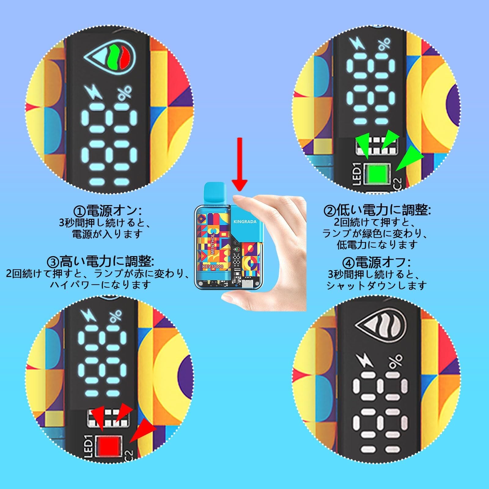 【煙量調節可能】使い捨て電子タバコの新製品が登場!特に調整可能な製品の電力ボタンが設定されており、3秒間長押しで電源が入ります。ボタンを2回連続で押すと、高出力(16W)に調整でき、本体の底のライトが赤く点灯します。ボタンを2回連続で押すと、低出力(11W)に調整でき、本体の底のライトが緑に点灯します。電源オフ: ボタンを3秒間長押して電源をオフにし、子供が誤って食べるのを防ぎます。