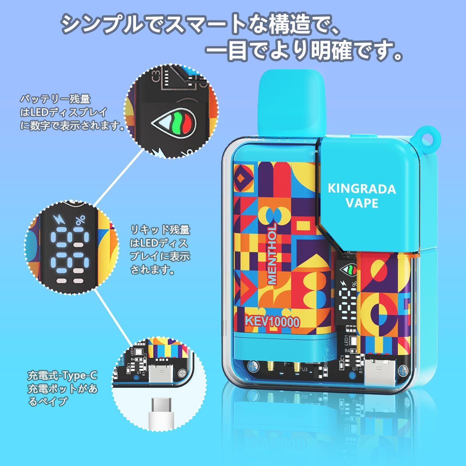 電子タバコ VAPE ベイプ シーシャ 9500回吸引可能 10風味 爆煙 大容量 使い捨て LEDモニター搭載 持ち運び 特製リキッド 水蒸気たばこ 禁煙サポート ニコチンなし 煙量調節可能 ストラップ付き Kingrada 13 Pro (メンソール)
