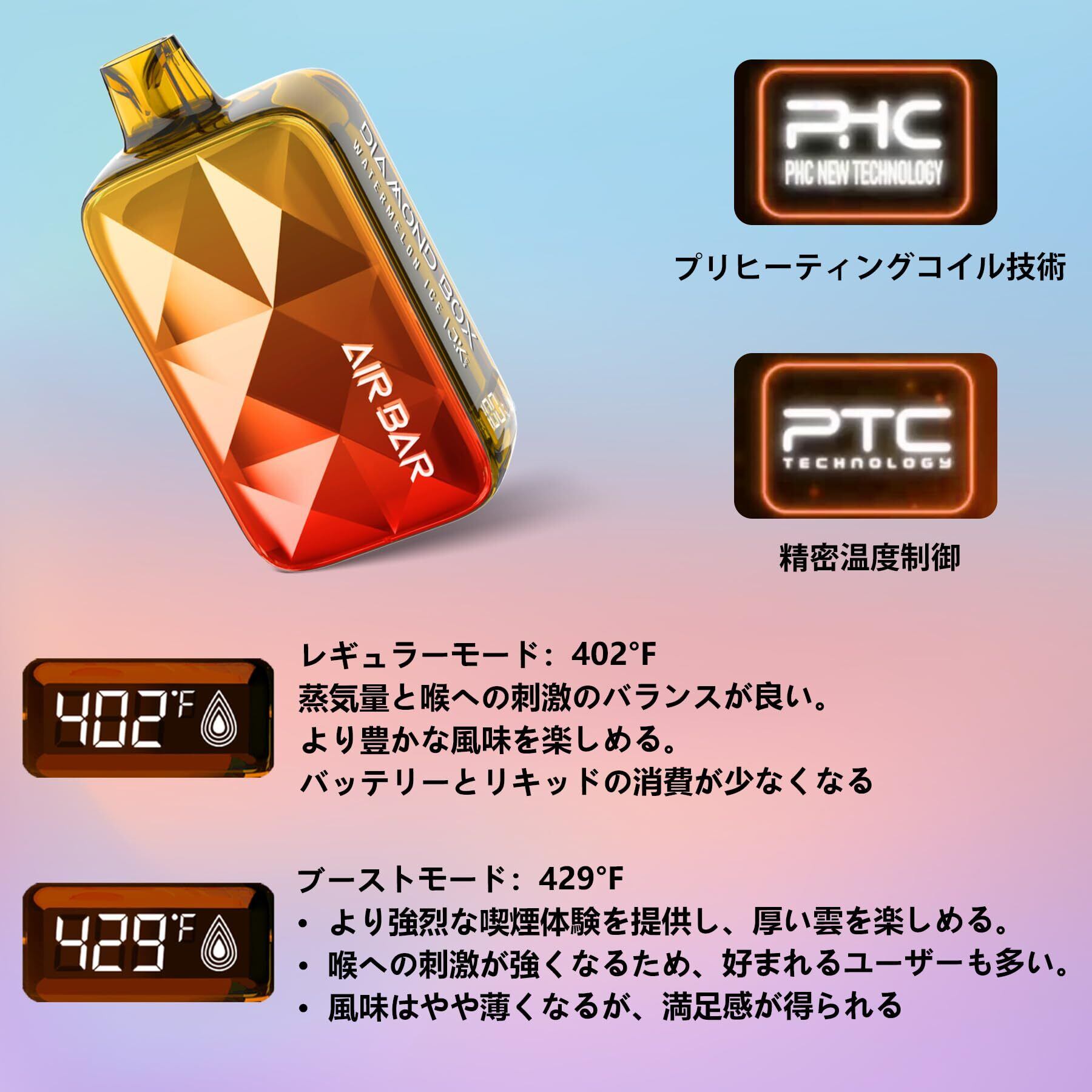 煙量調節可能:ベイプエンジン搭載により、ブーストモードと通常モードを切り替え、煙量を調節できます。これにより、異なるVaping体験が楽しめ、個々の好みに合わせた吸引が可能です。