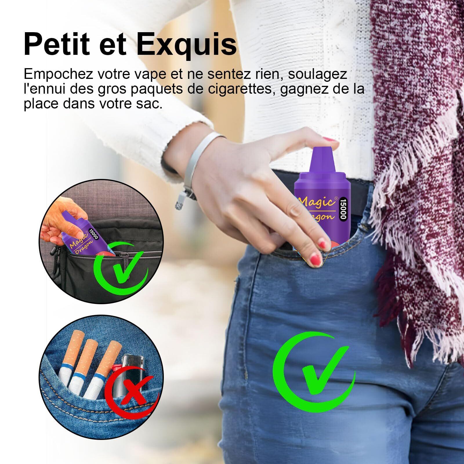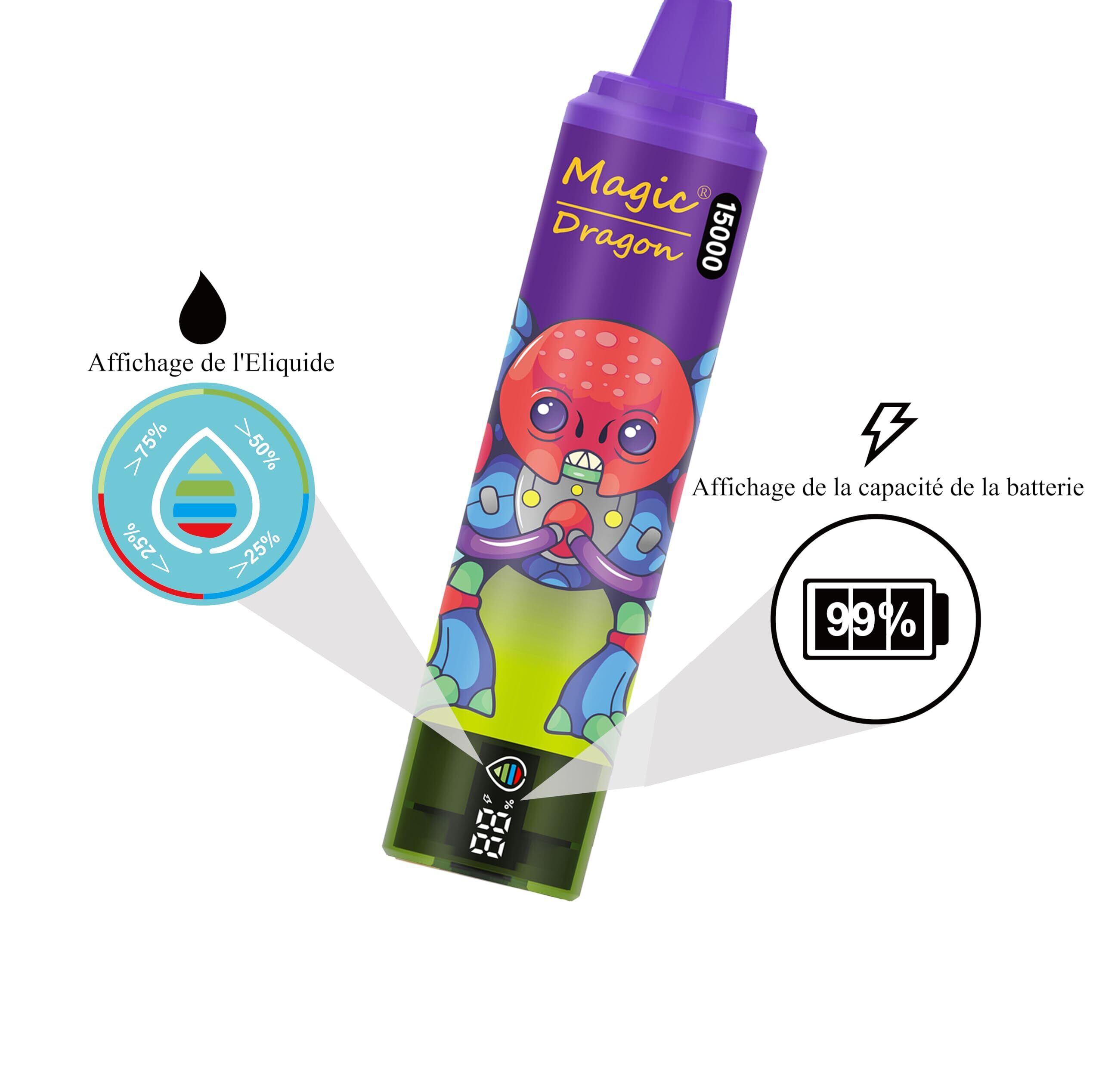 拡張されたパフ容量:使い捨て電子タバコの容量は最大15,000パフで、頻繁に交換する必要がありません。デバイスには850mAhのバッテリーも付属しており、長時間のベイピングセッションに十分な電力を供給するため、お気に入りのフレーバーをより長く楽しむことができます。