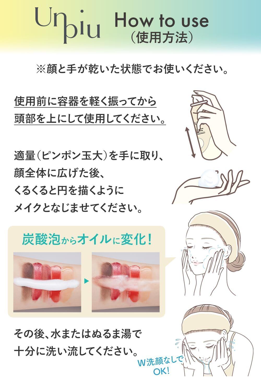 使用前に容器を軽く振ってから、頭部を上にして使用してください。顔と手が乾いた状態でお使いください。適量(ピンポン玉大)を手に取り、顔全体に広げたあと、くるくると円を描くようにメイクとなじませてください。その後、水またはぬるま湯で十分に洗い流してください。