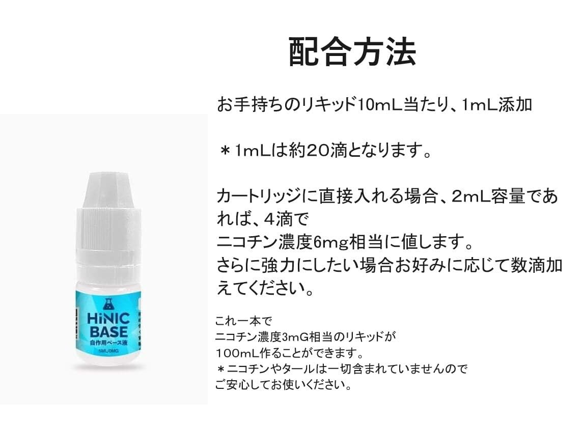 ベース液の選択肢: HiLIQのHiNICベース液を使用しており、キック感とスロートヒットを調整できます。