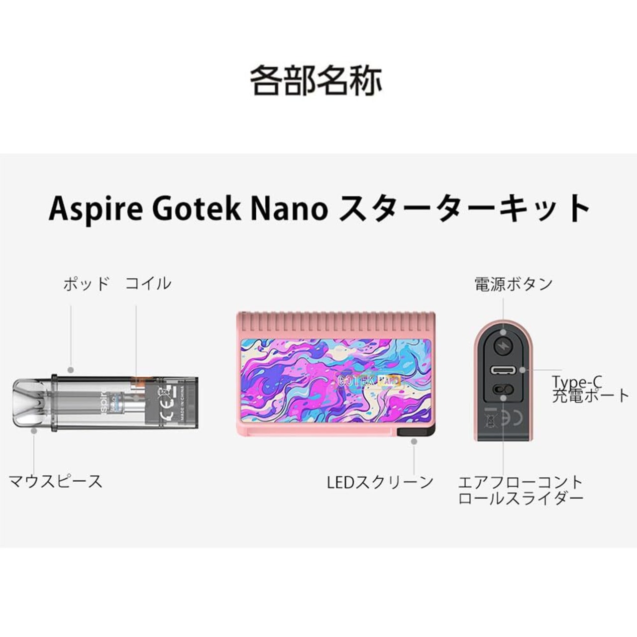 「Gotekシリーズポッドに対応」アスパイア ゴテック ナノはGotekシリーズのポッドに対応しています。0.6Ωと0.8Ωのリフィル可能なポッドから選び、好みのフレーバーを調整できます。持ち運びに便利なデザインで、MTL/RDTLスタイルのベイプを楽しむのに最適です。