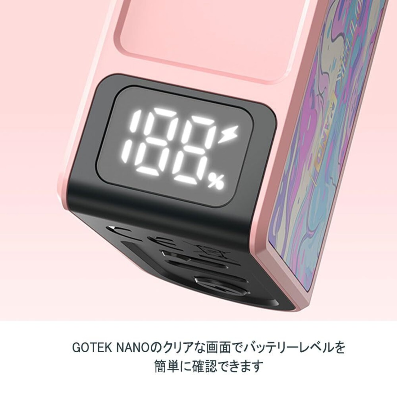 「簡単にバッテリーチェック」Gotek Nanoのバッテリーレベルスクリーンで、電子タバコのバッテリー残量を簡単に確認できます。Type-Cセットの利便性で、バッテリー管理もスムーズです。