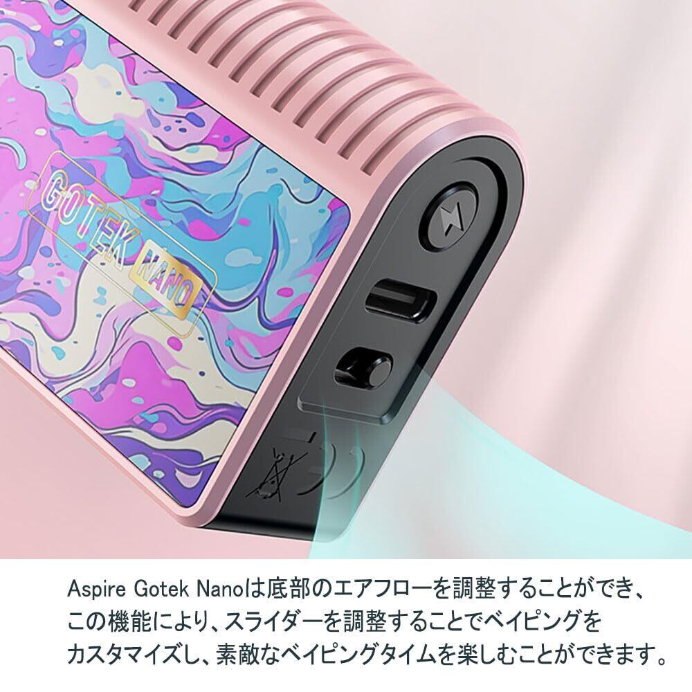 「ドローアクティベーション」複雑なボタンや設定に悩まされることなく、ドローアクティベーションシステムで簡単にベイプを楽しめます!電子タバコとして、アスバイア Gotek Nanoは持ち運びにも便利で、外出先でも手軽にベイプを楽しむことができます。