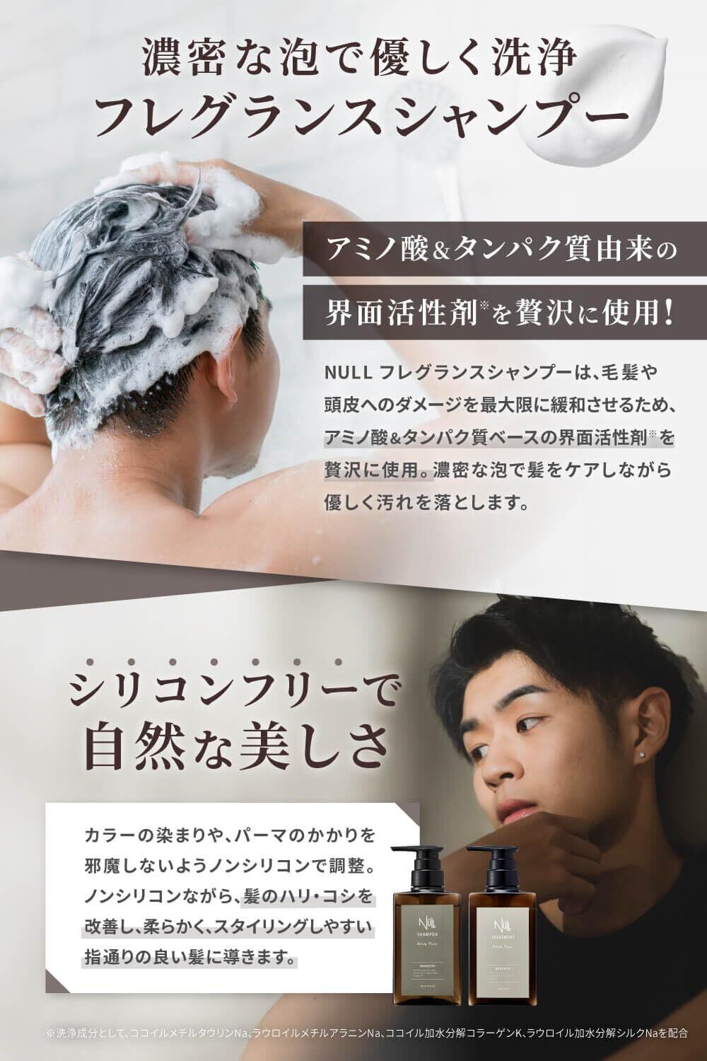 【 ダメージセンサーで髪を補修 】NULL フレグランス シャンプー & トリートメント は、ダメージに反応しその部分を補修する成分(キトサンヒドロキシプロピルトリモニウムクロリド)を配合。髪のダメージをしっかりと補修し、健やかな状態に導くことで髪にハリコシを与えます。
