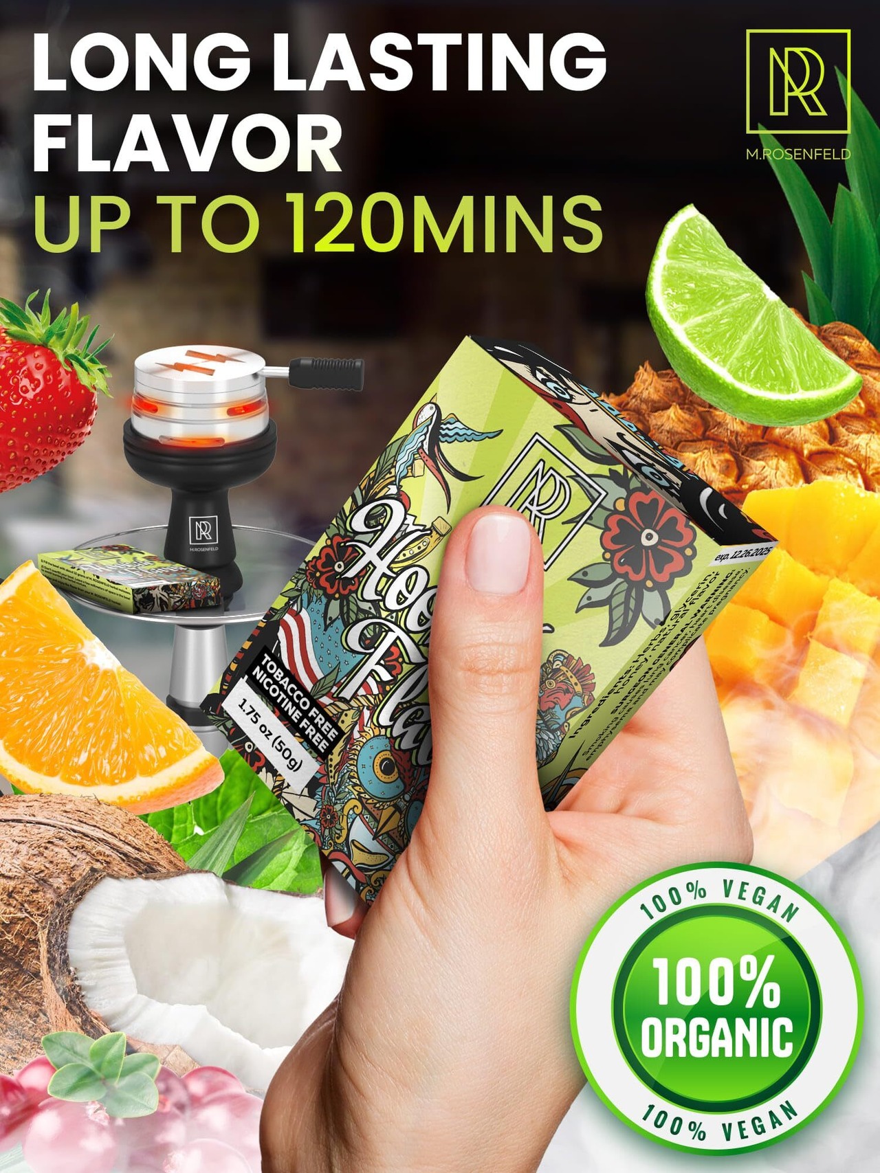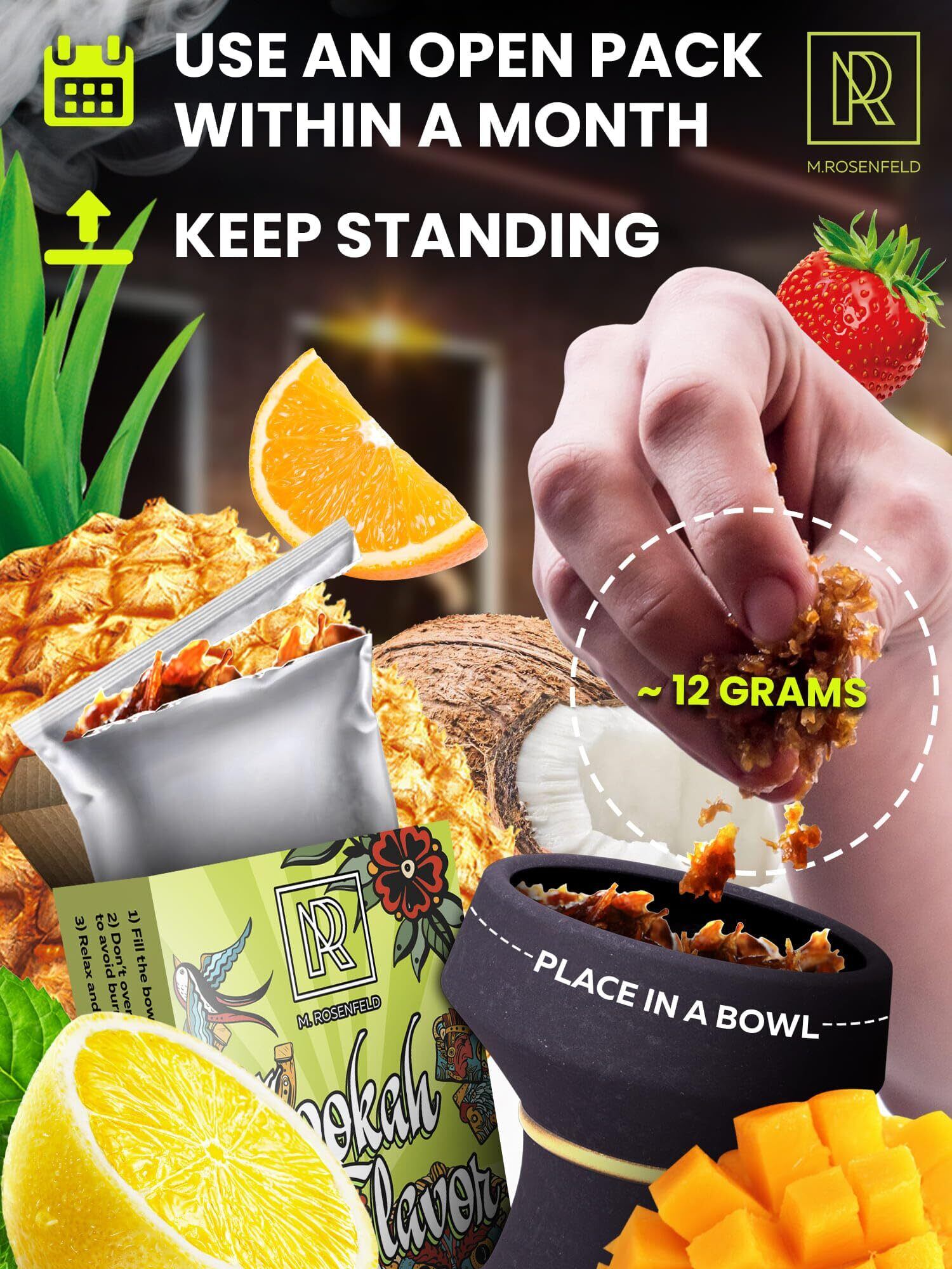 【互換性バッチリ】フレーバー シーシャ 各50gはシーシャ 本体 すべてのボウル形状にフィット。10杯分の個包装で持ち運び衛生的、カイピリーニャからセックスオンザビーチまで気分で選べるからパーティーでもシェア自由。プレミアムブランドM. ROSENFELDで差をつける。映えるパッケージ。