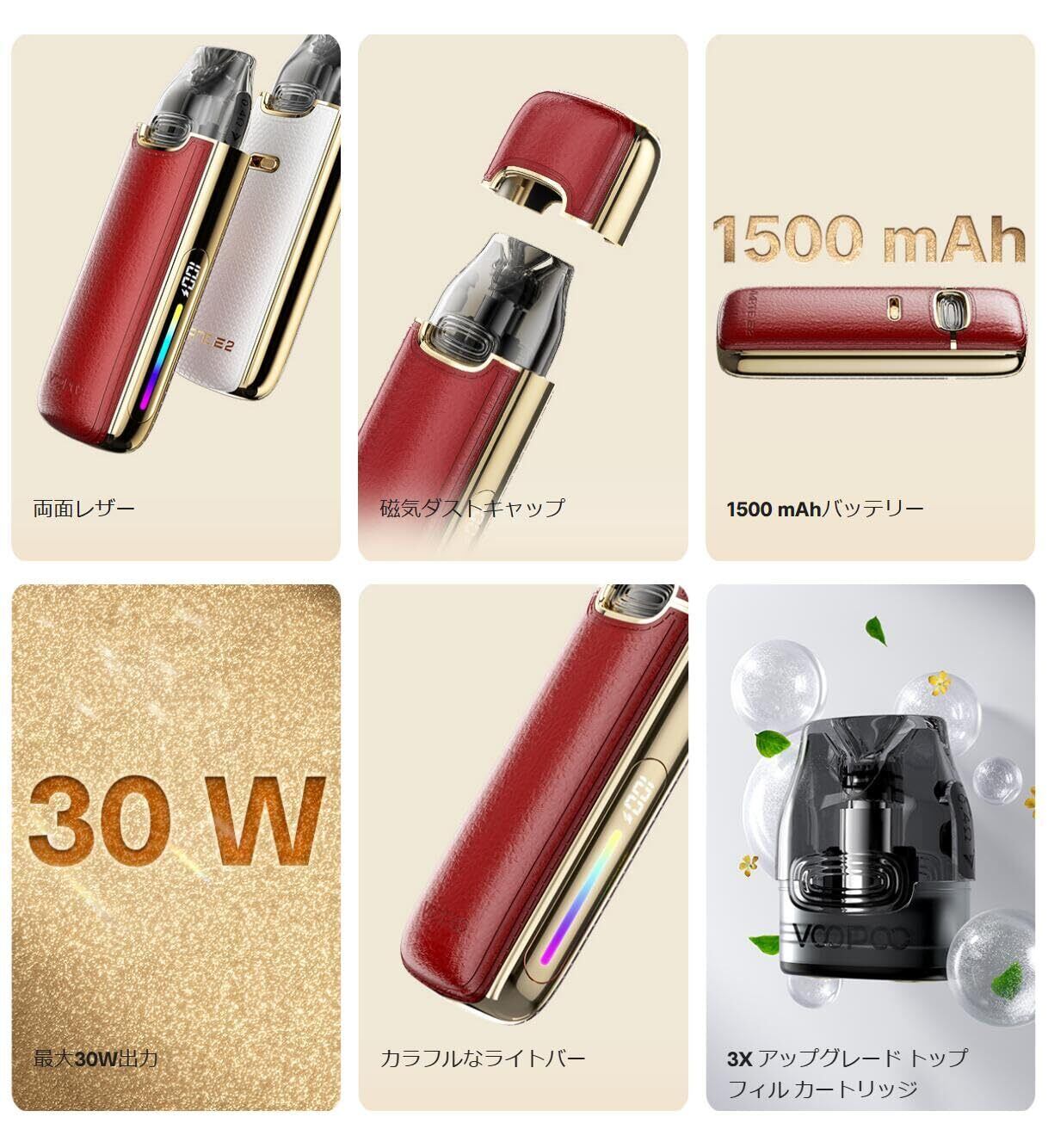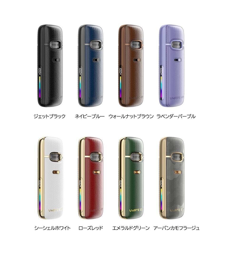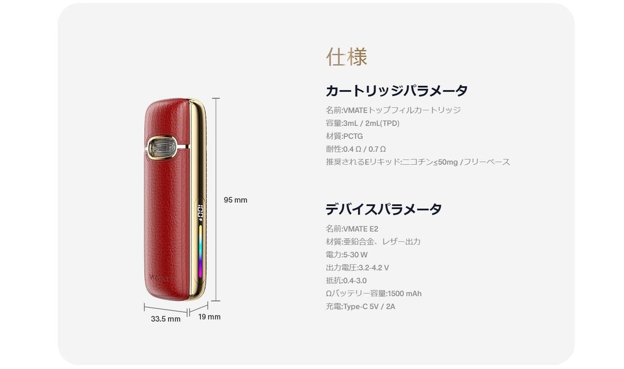 製品仕様 サイズ:95 * 19 * 33.5mm 製品素材:亜鉛合金+両面レザー POD容量:3ml バッテリー容量:1500mAh (内蔵) 充電:Type-C 5V/2A エアフロー調整:無段階エアフロー制御 インタラクティブディスプレイ:カラフルなインジケーター+バッテリーレベルディスプレイ 対応カートリッジ: Vmate カートリッジ 0.4Ω / 0.7Ω / 1.2Ω 内容品 Vmate E2 本体 Vmate カートリッジ 3.0ml (0.4Ω) Vmate カートリッジ 3.0ml (0.7Ω) 1* Type-C ケーブル 1* ユーザーマニュアル
