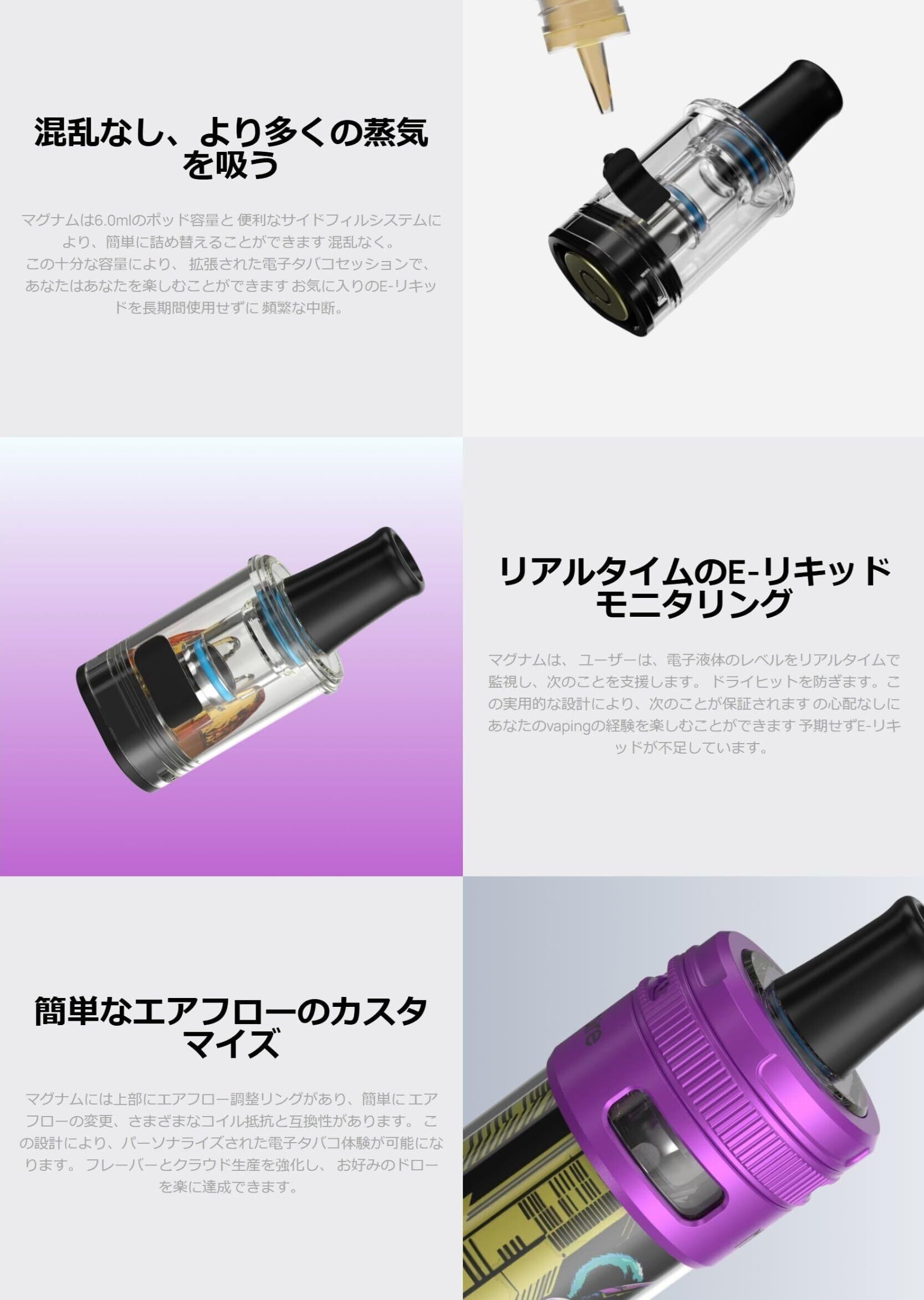 特徴 ・リアルタイムのE-Liquidモニタリング ・DTL用に設計 ・大容量3800mAh内蔵バッテリー ・多機能照明システム ・十分な6.0mlのEリキッド容量 ・調整可能なトップエアフロー ・オートドロー ・電源スイッチ/ライトON/OFFスイッチ ・810ドリップチップ 交換可能 仕様: サイズ:148.5×34×34.6mm(ドリップチップを含む) 重量:158g ポッド容量:6mL リキッド充填:サイドフィリング エアフロー:調整可能 バッテリー容量:内蔵 3800mAh 起動:オートパフ 充電ポート:Type-C 2A 810ドリップチップ 対応カートリッジ:Aspire magnum pod 0.25Ω/0.4Ω