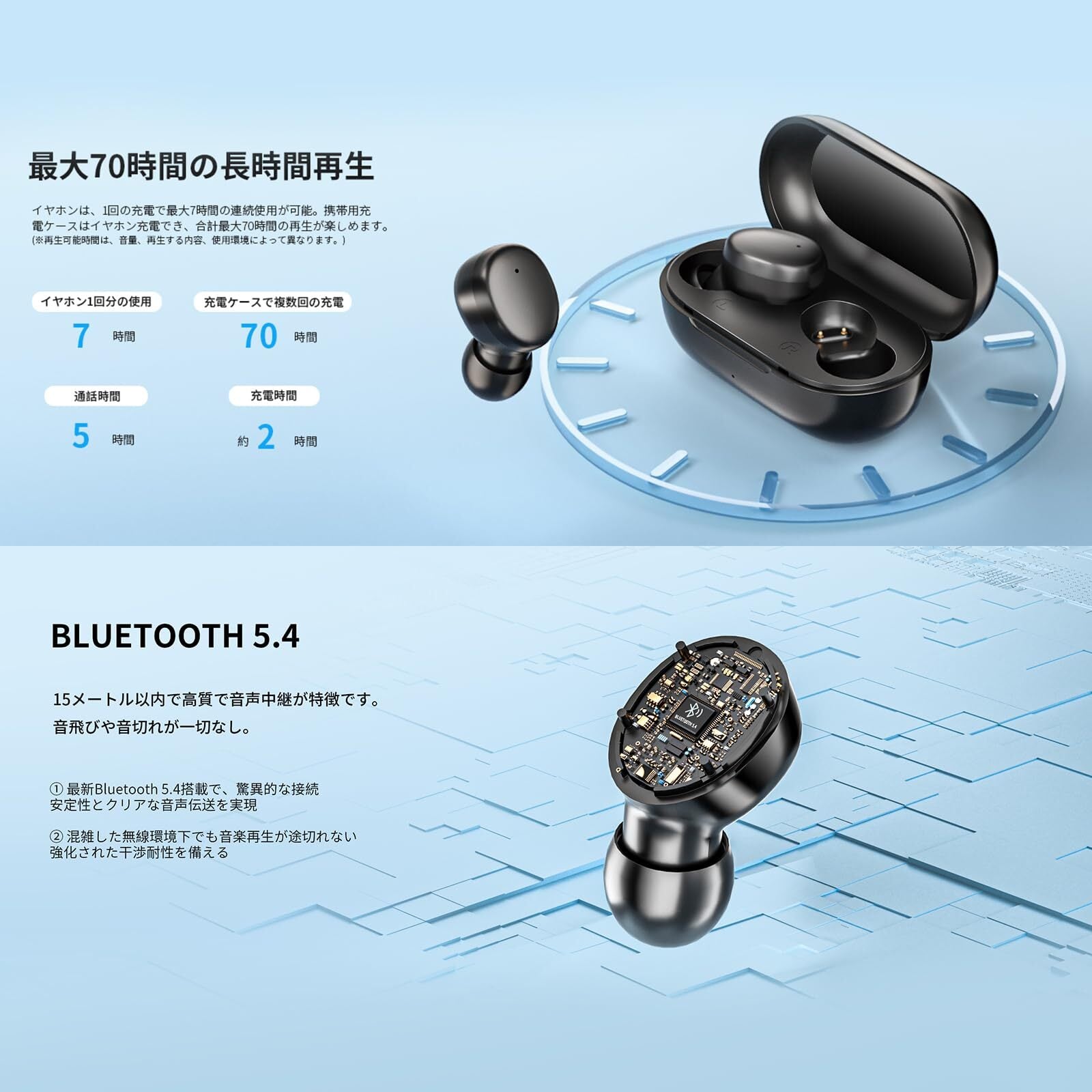 Bluetoothイヤホン ワイヤレスイヤホン 音量調整【2025最新EDR+Bluetooth5.4搭載】 iPhone/Android/Pad適用 接続瞬時 スマートENC通話 最大70時間駆動/充電ケース複数回充電対応 小型/軽量 片耳/両耳 スポーツ/通勤通学/WEB会議