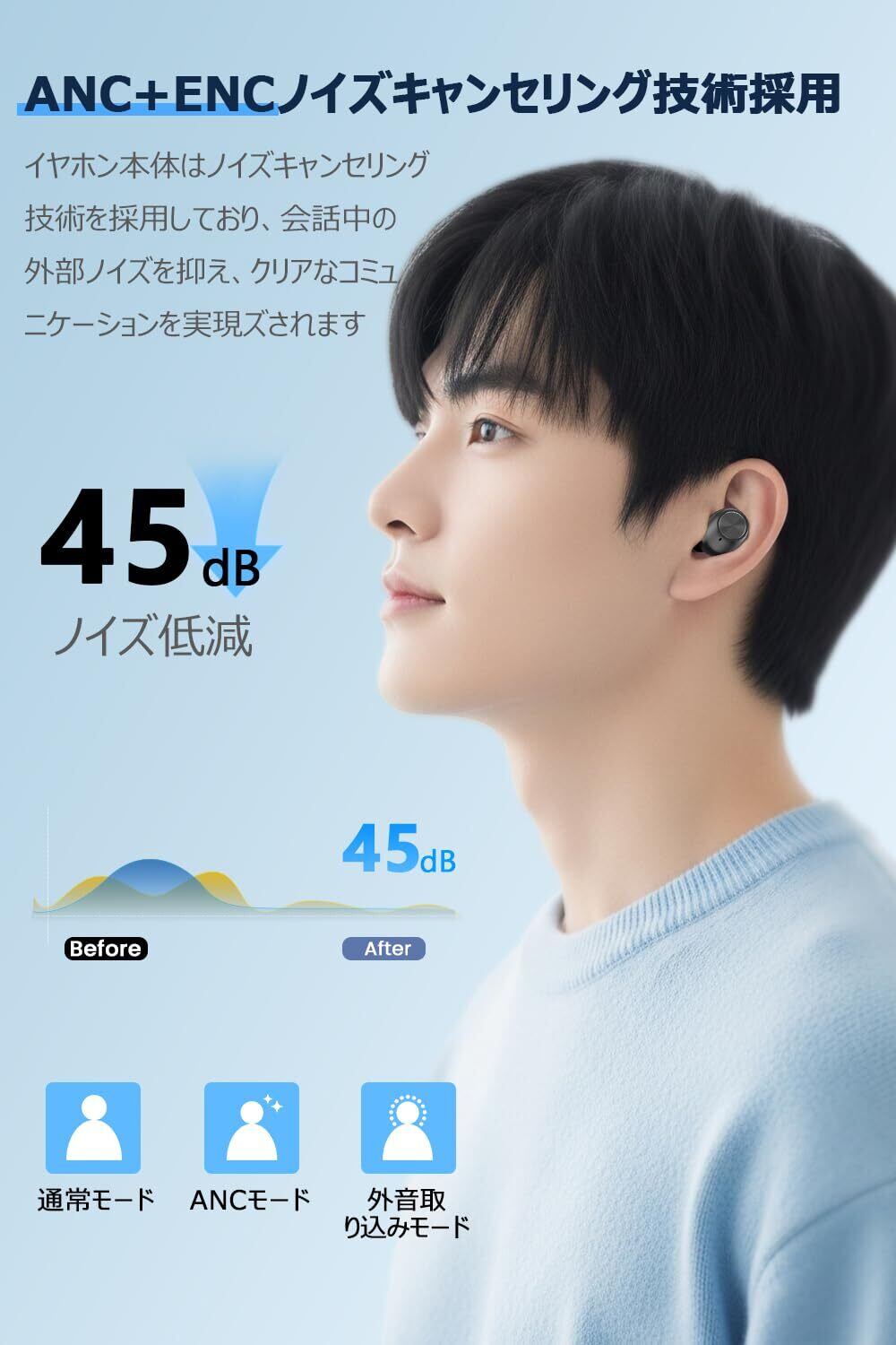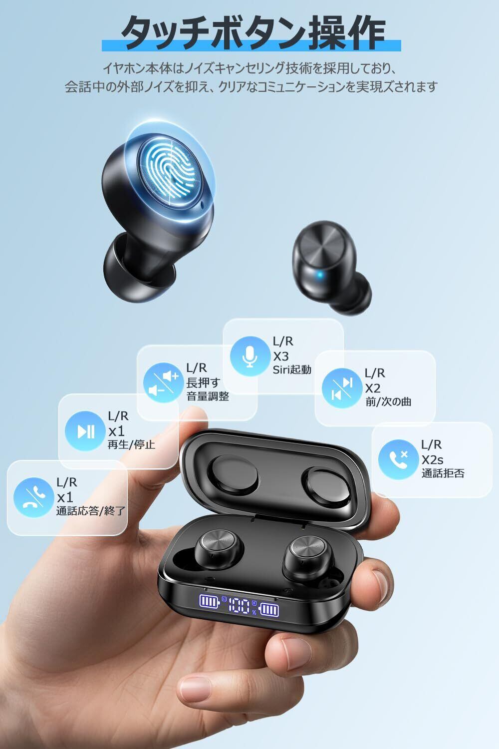 【タッチボタン】本bluetoothイヤホンはタッチコントロール対応で、ポケットからデバイスを取り出しなくても音量調整/音楽再生/一時停止、通話/終了/拒否/次の曲/前の曲/Siri起動などの簡単な操作ができます。【IPX7防水】IPX7防水性能により、どちらの方向からの水の飛沫も入られません。汗や塵を防ぎ、ランニング、フィットネス、アウトドアスポーツなど運動中に汗をかいても大丈夫です。※ご注意:充電ケースは防水仕様ではありません。【パッケージ内容】パッケージ内容:充電式収納ケース、Bluetoothイヤホン*2、Type-C充電ケーブル、イヤーピース×3ペア(Mが初期装着)、日本語取扱説明書。