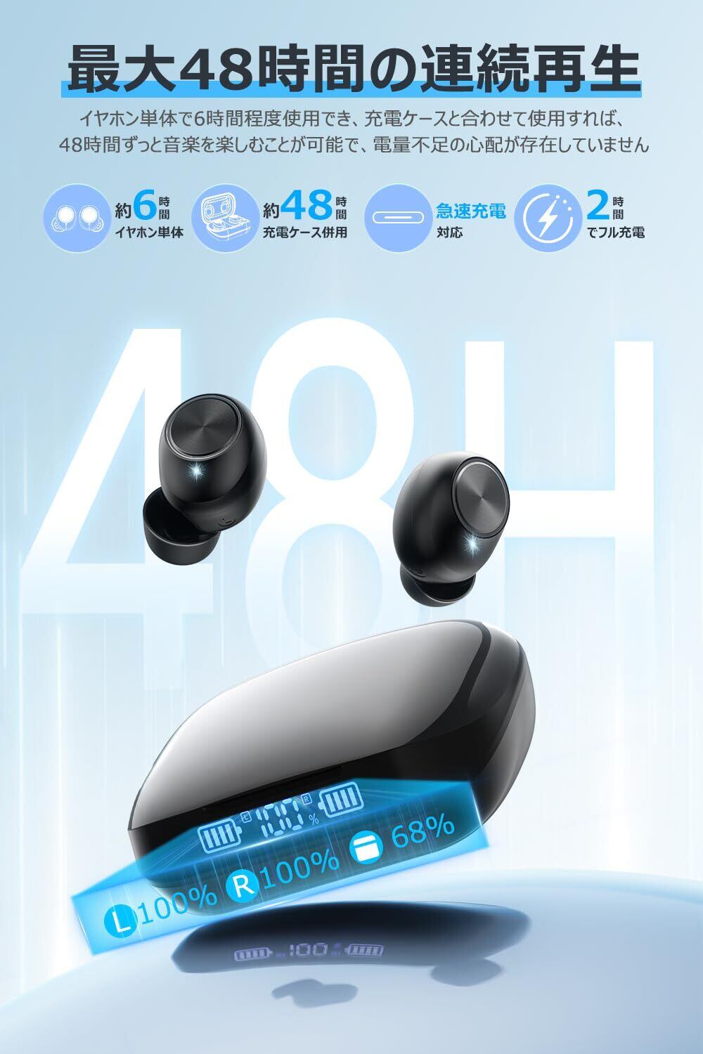 【最大48時間連続使用・LED残量表示・Type-C急速充電】先端Bluetoothチップかつ省電力設計により、T08は一回のフル充電だけで約6時間連続音楽再生が実現でき、左右のイヤホンを交互に使えば最大12時間までに連続再生でき、充電ケースとあわせて合計最大48時間の使用可能です。また、転送速度・互換性に優れたType-C急速充電対応で、充電時間を短縮し快適に使用できます。さらに、LEDディスプレイ電池残量表示付きで、充電ケースの電池残量が一目瞭然です。充電切れの心配が全く不要です。【片耳/両耳使用対応】どちらのイヤホンを取り出しても単独で使用できます。両耳のイヤホンを装着すると立体音響をより力強く耳に届けます。好みや使用シーンに合わせて使い分けることができます。