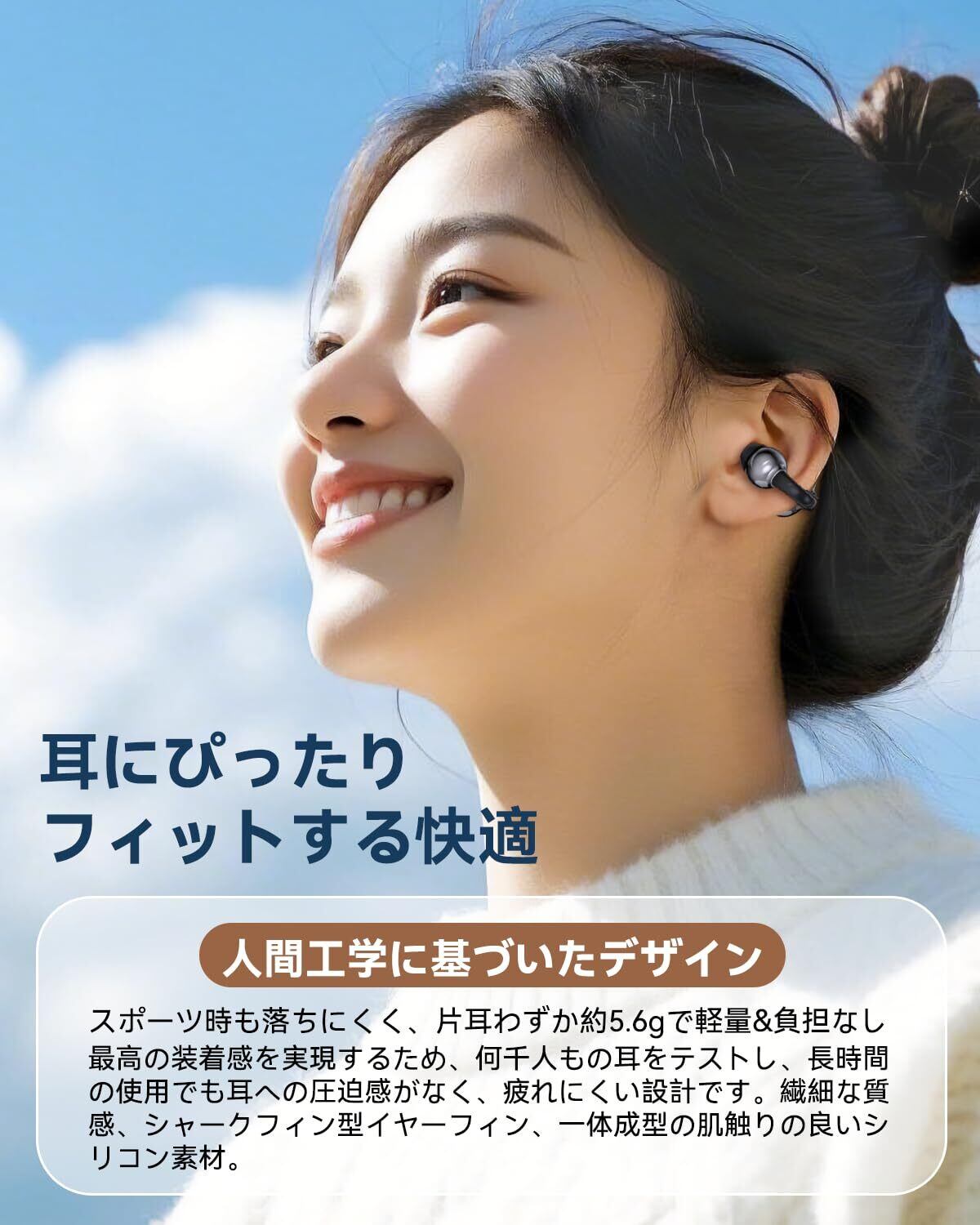 【人間工学に基づいたデザイン】このBluetoothイヤホンは、人体工学に基づいたデザインで、耳の自然な形状にぴったりフィットします。長時間の使用でも快適で、圧迫感がなく、スポーツ中でもしっかりと装着され、落ちる心配はありません。ランニングやサイクリング、ジムでの高強度トレーニングなど、激しい動きでも安心して使えます。軽量で柔らかなイヤーチップが、長時間の使用でも快適さを提供し、音楽や通話を自由に楽しめます。忙しい日常でも、スポーツ時でも、あなたのライフスタイルにぴったりのイヤホンです。はお客様に信頼される会社となることを目標として日々努力しております。製品に関してお困りな事や不具合等がございましたら、ご心配なさらないでご連絡ください。連絡方法:「アカウントサービス」>「注文履歴」>「販売元」>「質問する」。
