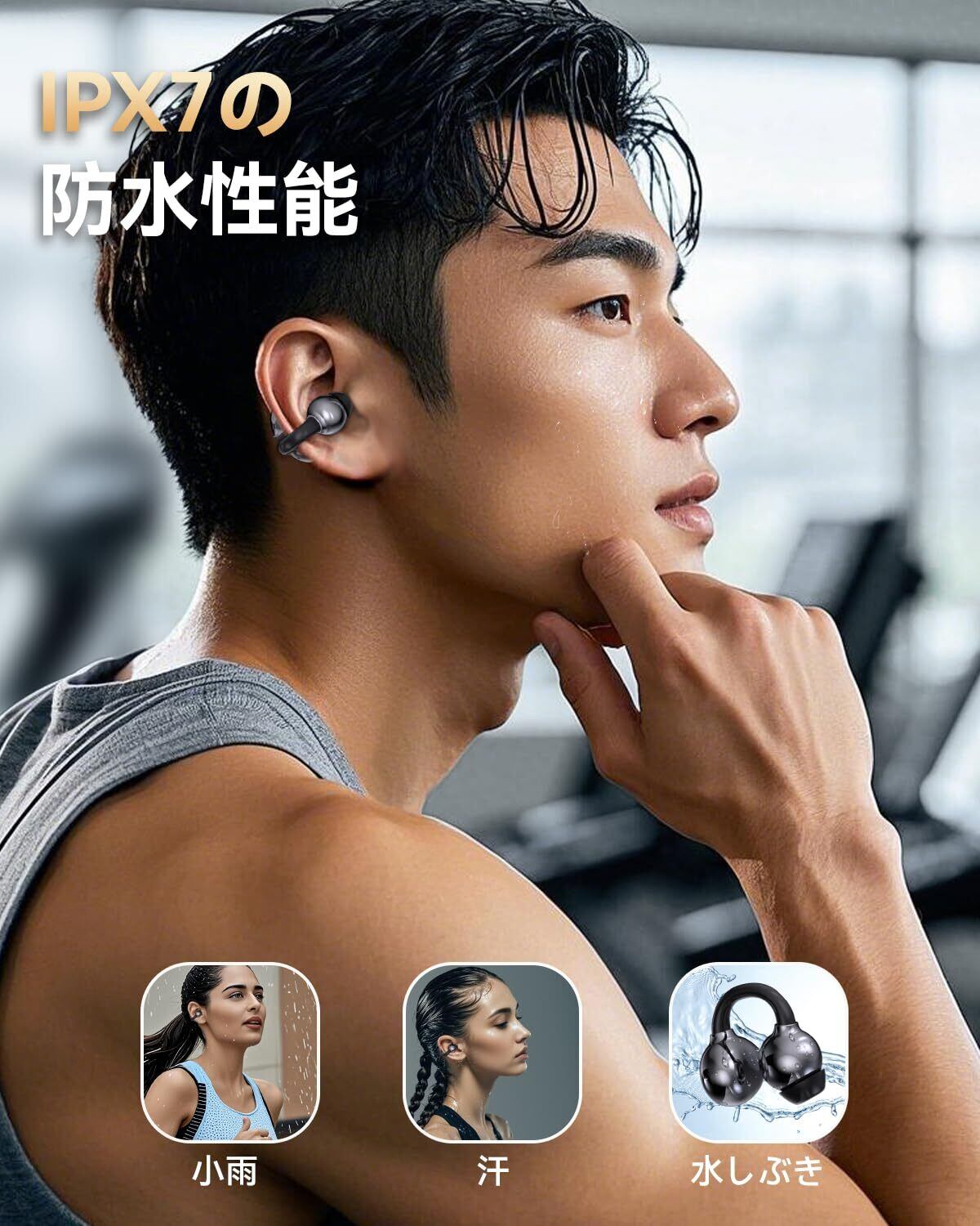 【IPX7防水性能】IPX7 防水防汗。高い防水性能を実現した完全ワイヤレスイヤホンは、ジムやランニング、フィットネスなどのスポーツ中、雨の日でも安心して使用できます。 ※ご注意:充電ケースは防水仕様ではありません。