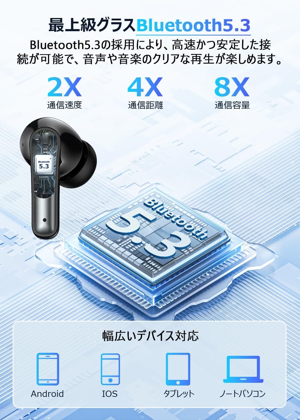 米国で1日5000個以上が売れた実績を持つワイヤレスイヤホンが日本で登場!【業界最先端レベルBluetooth5.3技術 蓋を開けたら接続】最先端技術Bluetooth5.3チームを採用、旧世代Bluetooth5.0チップと比較すると省電力性や接続の安定性が格段に向上しました。動画視聴の際の映像と音声のずれも旧モデルから大幅に低減させ、スムーズなゲーミング&動画視聴体験が可能します。本Bluetooth イヤホンは初めて手動的に接続してから、再度起動時に、イヤホンを充電ケースから取り出したら自動電源オン、one stepだけ自動接続できます。同規格のイヤホンモデルより快適な使用体験感を提供させていただきます。️また、バッテリー消費を抑えられるので、長距離の移動時にも適しています。通学や通勤などの外出時でも、在宅勤務中や会議中などの自宅での使用時でも、いつでも安定して接続でき、途切れなどの心配がありません。