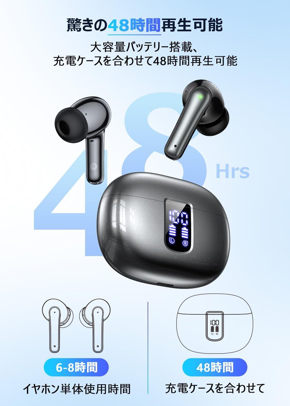 【最大48時間再生&明瞭なLEDディスプレイ】このぶるーとーすイヤホンは大容量バッテリーを持ち、省エネルギー設計により、満充電でイヤホン単体が6-8時間、充電ケースと併せて片方は最大48時間ので、収納しながら電池切れの心配が少ない。急速充電Type-Cポートを採用されますので、充電のスピードが従来のMicro USBより著しく早くなりました。万が一バッテリー残量がなくなっても、約10分の充電で約60分再生可能です。充電時にも非常に便利、面倒な操作が不要し、どちらの向きでも挿し込むことができます。人気のLED電量表示インジケーター付き、高級感の青色で明瞭に溢れて、充電ケースのバッテリー残量はLEDディスプレイに数字で表示され、100%から1%まで刻みで、イヤホンは4目盛りのLEDディスプレイで充電の状況は確認できます。