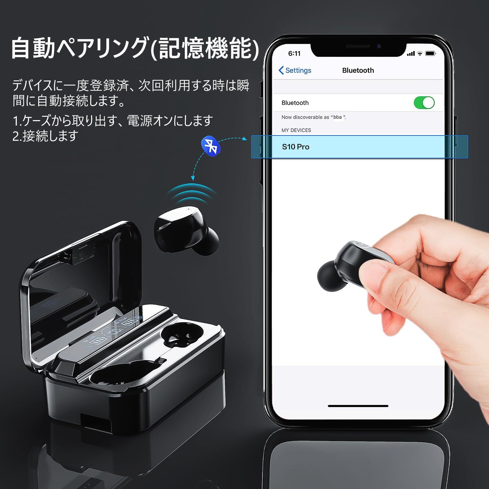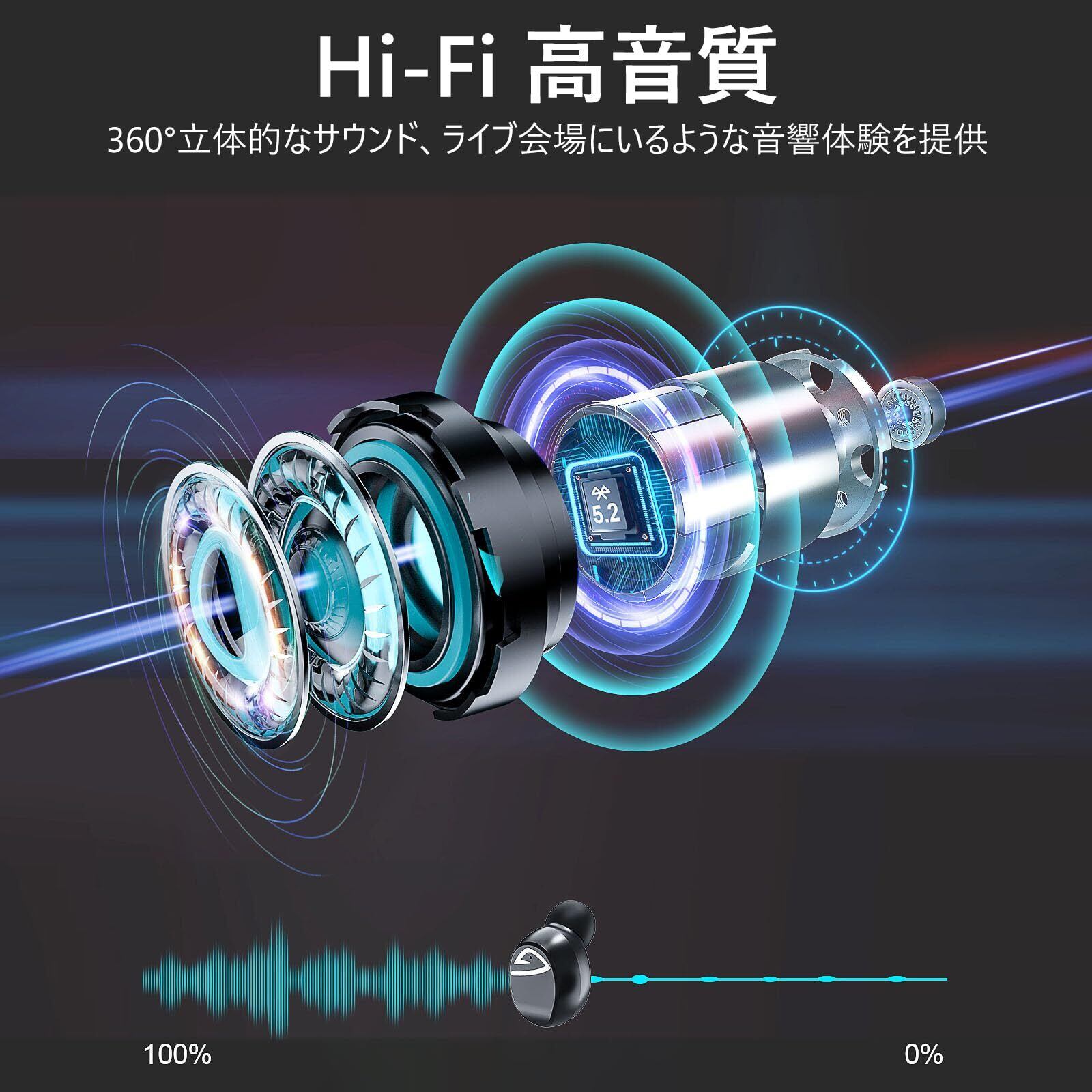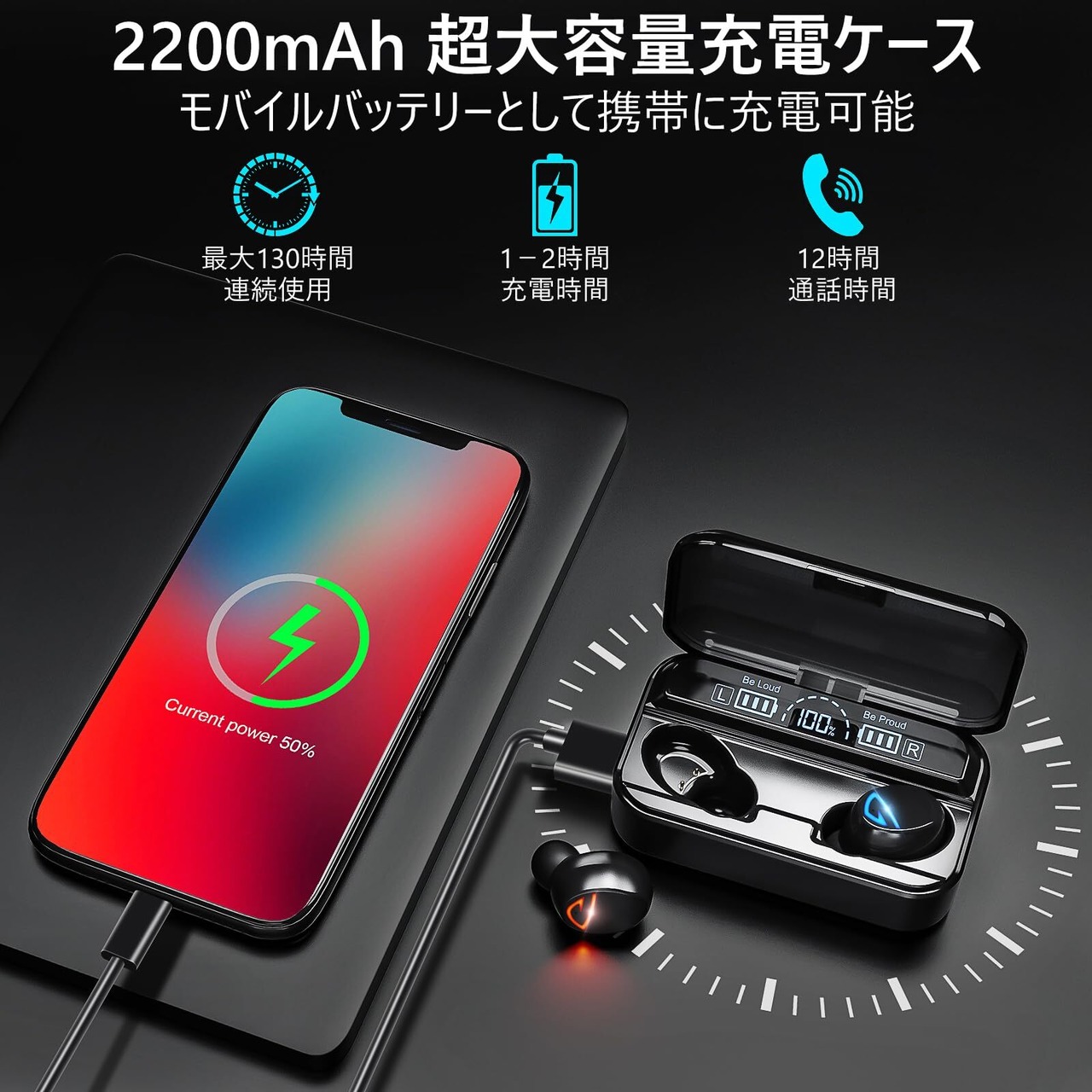 Bluetooth イヤホン 完全ワイヤレス 2200mAh充電ケース付き イヤフォン本体12時間再生/合計130時間再生 Hi-Fi 最新Bluetooth5.2+EDR搭載 3Dステレオサウンド AAC対応 ノイズキャンセリング機能 自動ペアリング LEDディスプレイ残量表示 良いフィット感 片耳/両耳モード切替 音量調整可能 IPX7防水