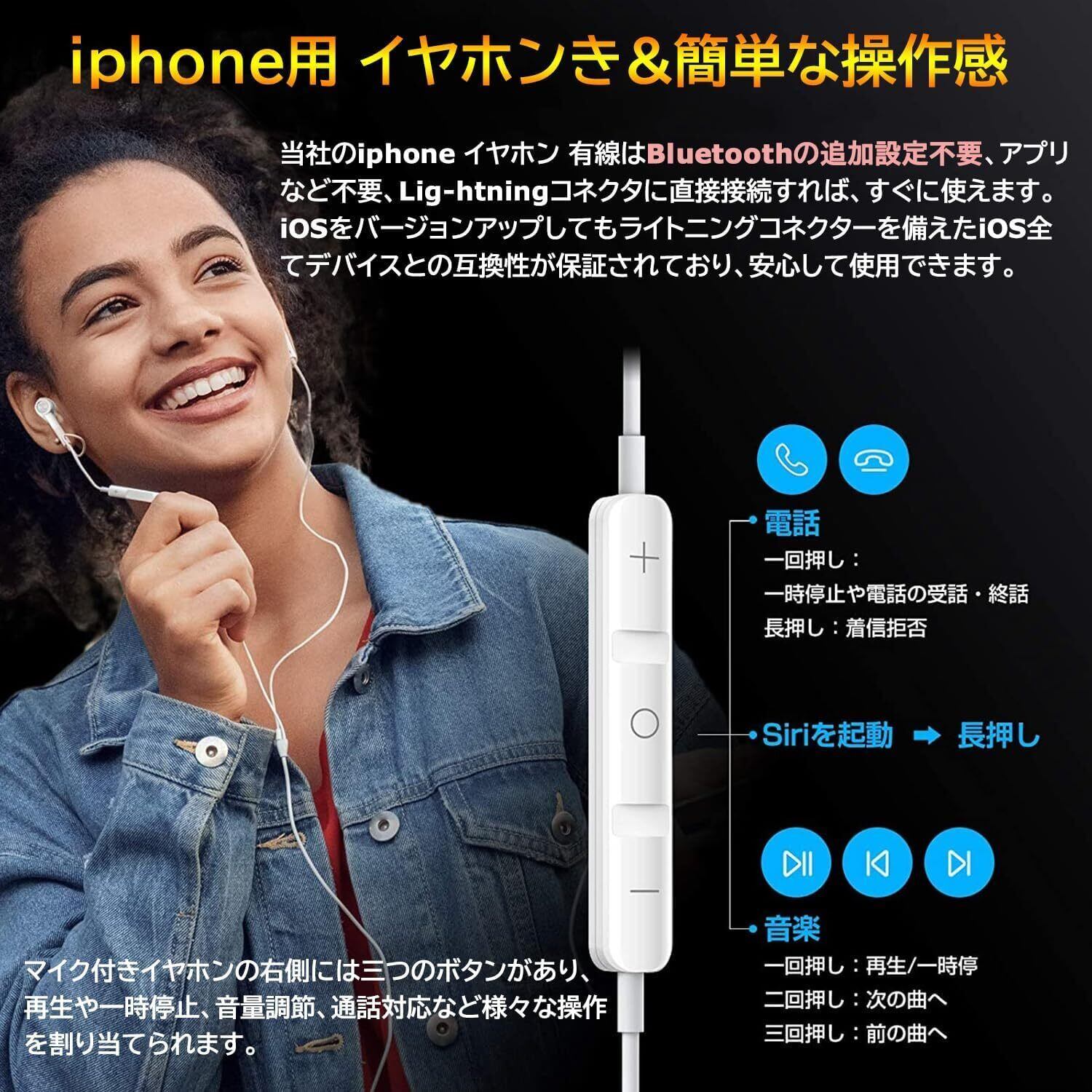 【iphone用 イヤホンき&簡単な操作感】当社のiphone イヤホン 有線はBluetoothの追加設定不要、アプリなど不要、Lig-htningコネクタに直接接続すれば、すぐに使えます。iOSをバージョンアップしてもライトニングコネクターを備えたiOS全てデバイスとの互換性がされており、安心して使用できます。マイク付きイヤホンの右側には三つのボタンがあり、再生や一時停止、音量調節、通話対応など様々な操作を割り当てられます。スマートフォンによる音楽の再生・一時停止や電話の受話・終話だけでなく、パソコンによるビデオ通話・ゲームにも利用できます。音の遅延もなく、ネット動画や映画、通話なども快適に楽しめます。長時間つけていても疲れにくく、手元でリモコンを操作できる。