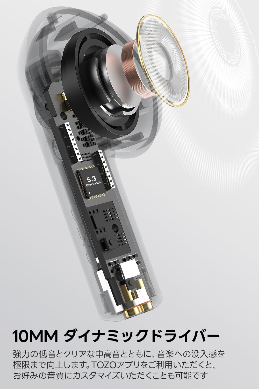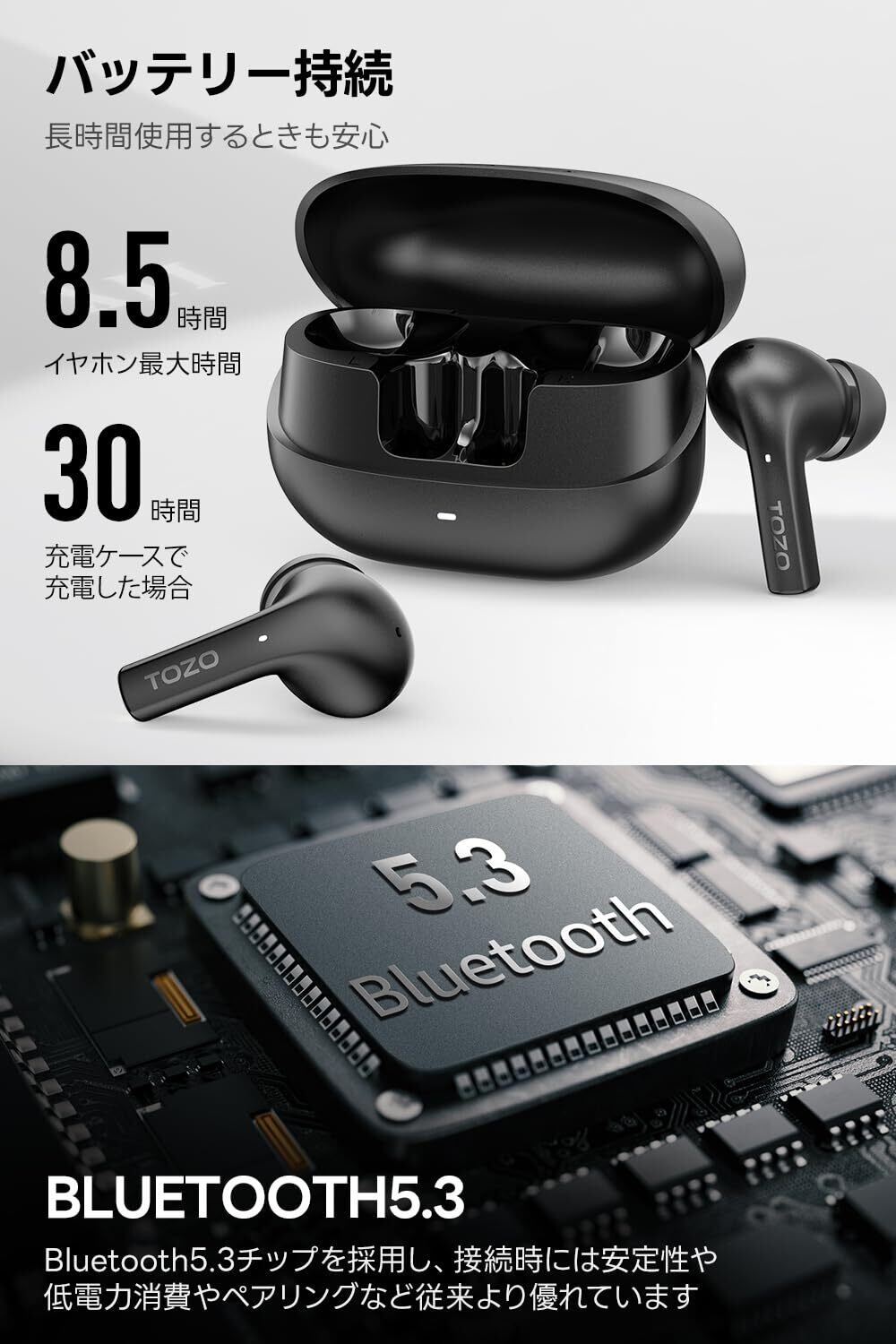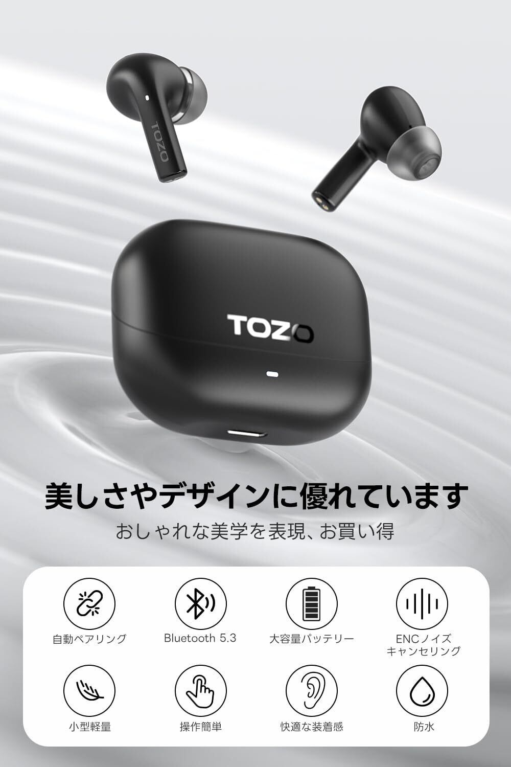 TOZO E2 ワイヤレスイヤホン 2025 極上の音体験 AI 通話時ノイズキャンセリング Bluetooth5.3 軽量小型 専用アプリ対応 カスタムEQ 最大約30時間の再生 自動ペアリング 低遅延 長距離接続 急速充電 Type-C ビジネス/会議/通勤/通学/スポーツ (ブラック) 電波法/技適認証済み商品