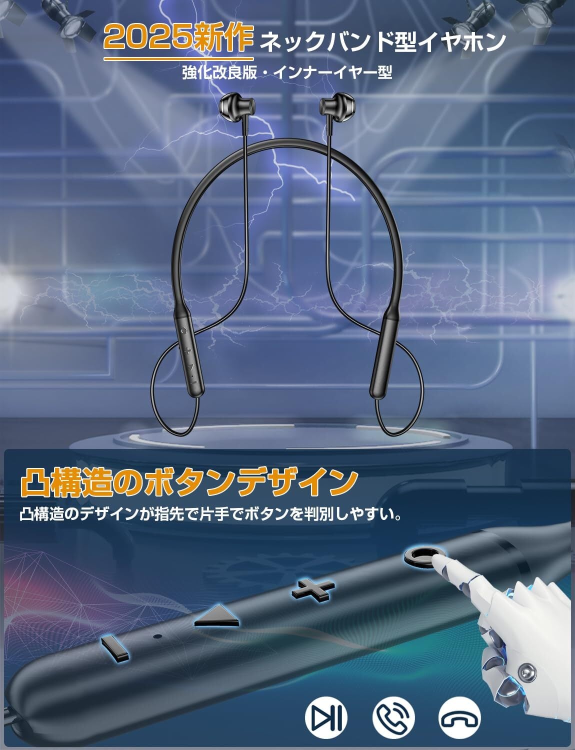 2025進化版ネックバンド型イヤホン、革新的な音響技術への情熱から生まれた新製品!【装着感良いインナーイヤ型・凸構造ボタン便利】今回開発された新製品は、人間工学に基づいた独自の形状と相まって、人の耳にも軽快にフィットするインナーイヤ型設計を実現しました。カナル型イヤホン特有の装着感/閉塞感が苦手な方に最適です。なお、凸構造ボタンで大きくて見なくて指先で判別しやすくなります。柔らかで頑丈な形状記憶シリコン材質と、細いケーブルで繋がっているイヤホン本体を組み合わせて、首から肩にかけての安定感は抜群、耳への負担が少ないです。