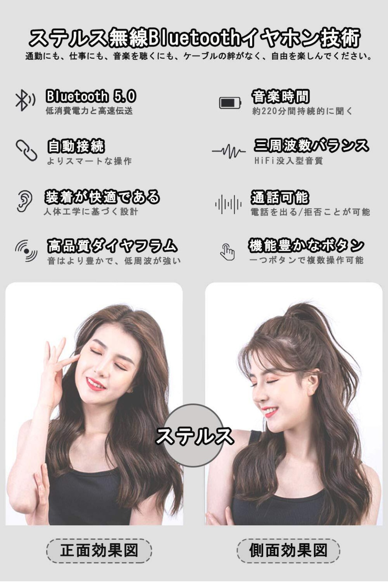 【優れたBluetooth 5.0&自動ペアリング】ワイヤレスでもよりクリアな音質で通話&音楽をお楽しめて疲れにくいです。 簡単・高速かつ途切れのないペアリング接続を体験できます。イヤホンを電源ONにすれば、イヤホンは自動にBluetoothペアリング設定の状態に入ります。スマホと接続して、待たずに高音質な通信&音楽を楽しめます。イヤホンを再起動する時、自動井最後の接続されたデバイスと接続します。