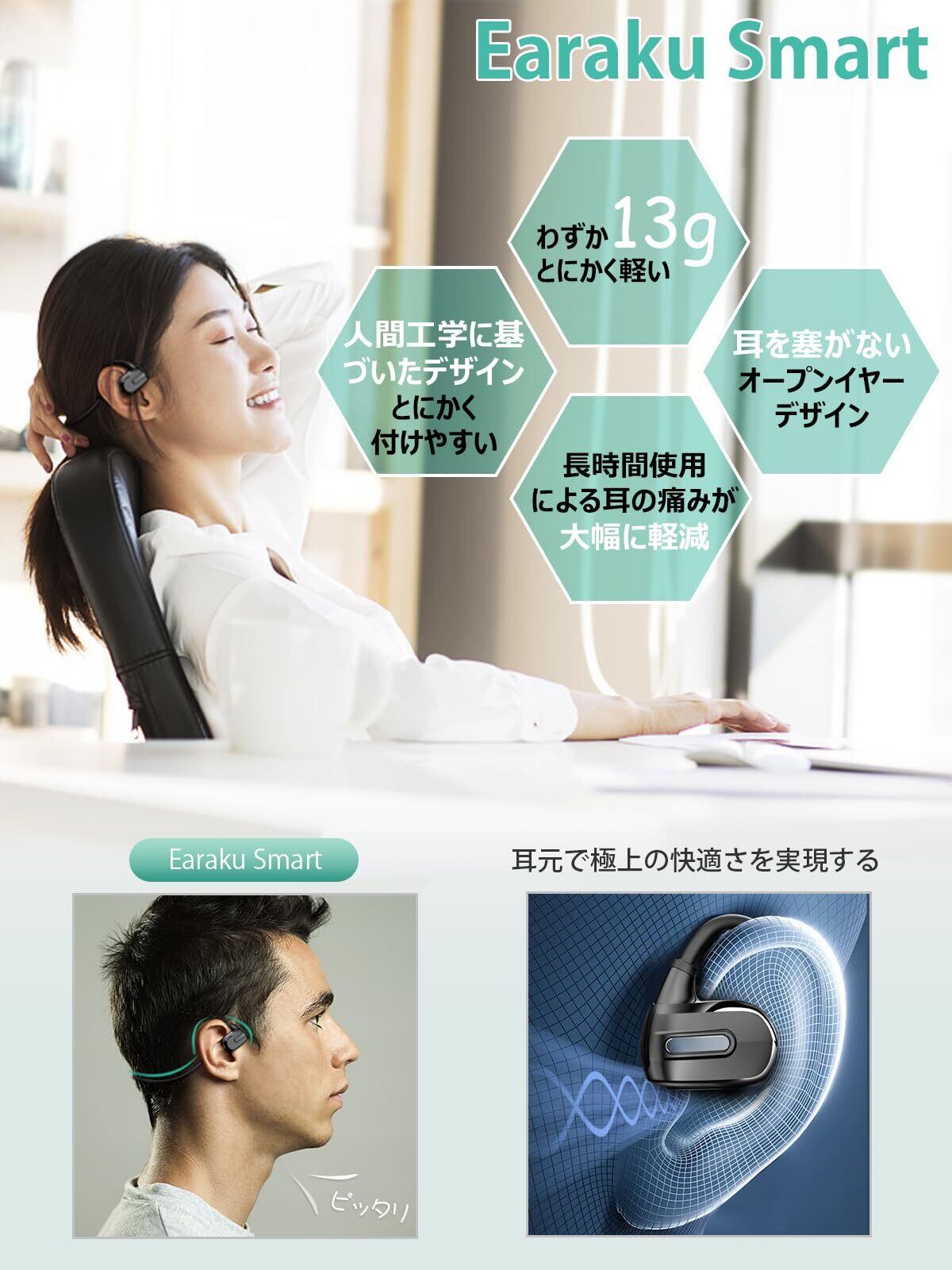 【2025年最新改良版 空気伝導イヤホン & 日本語音声ガイド】2025年の業界最前線を行く空気伝導イヤホンが登場!Earakuの「第四世代 Earaku Smart」は、アジア圏で20万人以上のフィードバックをもとに開発された革新的モデルです。人間工学に基づいたデザインで、長時間の使用でも快適な着け心地を実現しています。