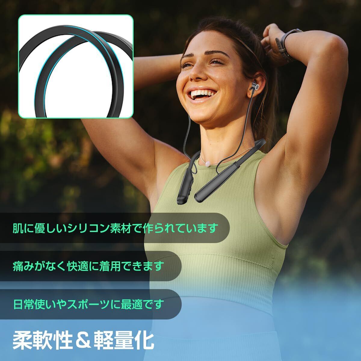 【80時間連続再生&軽量かつ快適】新登場の80時間連続再生のネックバンド型イヤホンはスポーツに最適な軽量サイズであるため装着時のフィット感がよく、長時間付けても痛みや違和感などありません、楽に使えます。ネックを巡っている部分は高い柔軟性のシリコンでつくられ、激しい運動でも肌に悪い影響を与えません。