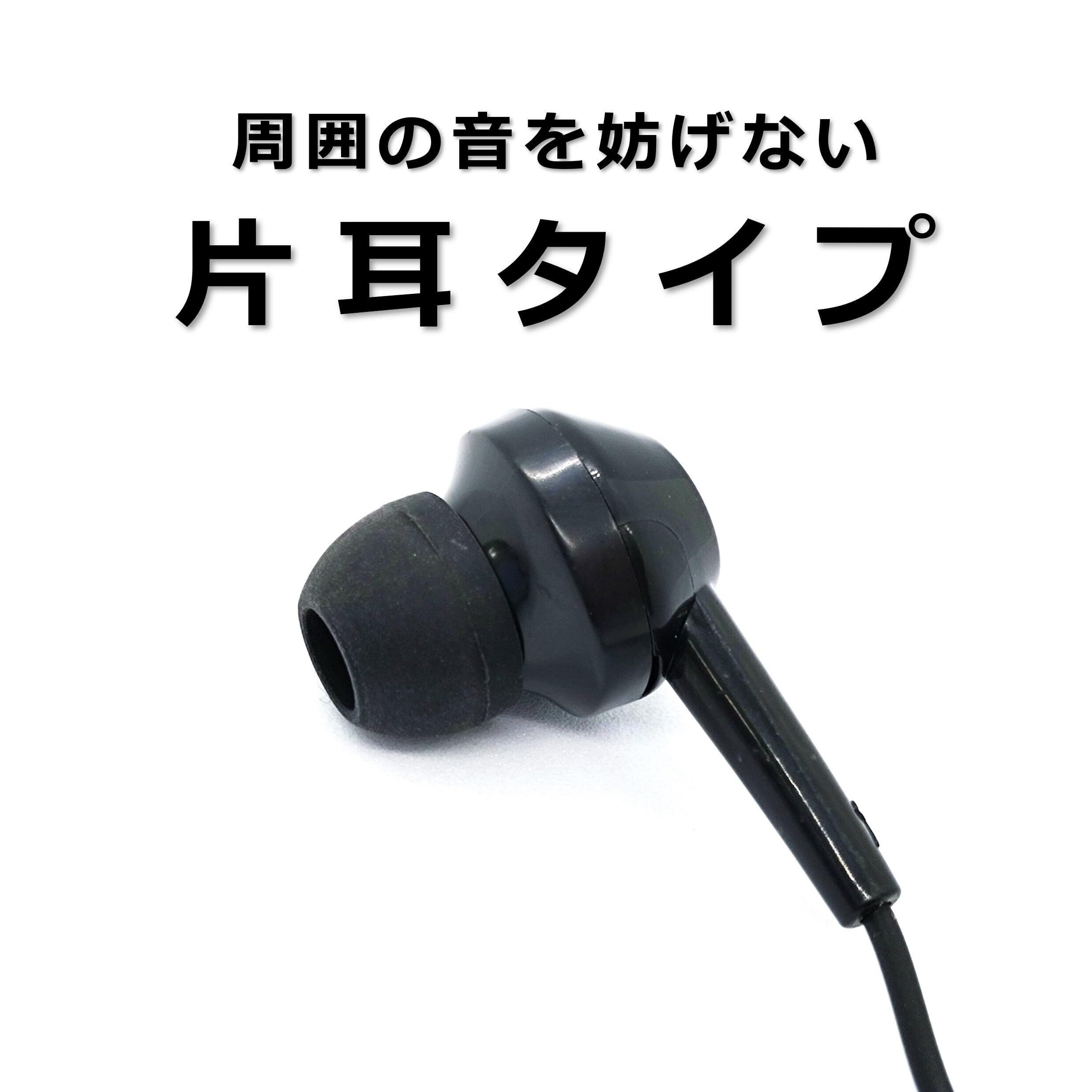 【製品仕様】●片耳カナル型イヤホン ●長さ:5m ●重量:約24g ●カラー:ブラック ●ステレオミックス ●ドライバーユニット:Φ15mm高磁力マグネット ●インピーダンス:32Ω ●音圧感度:95±3dB ●最大入力:5mW ●再生周波数:20~20,000Hz ●コード:OFCリッツ線 ●プラグ:Φ3.5mm金メッキステレオミニプラグL型