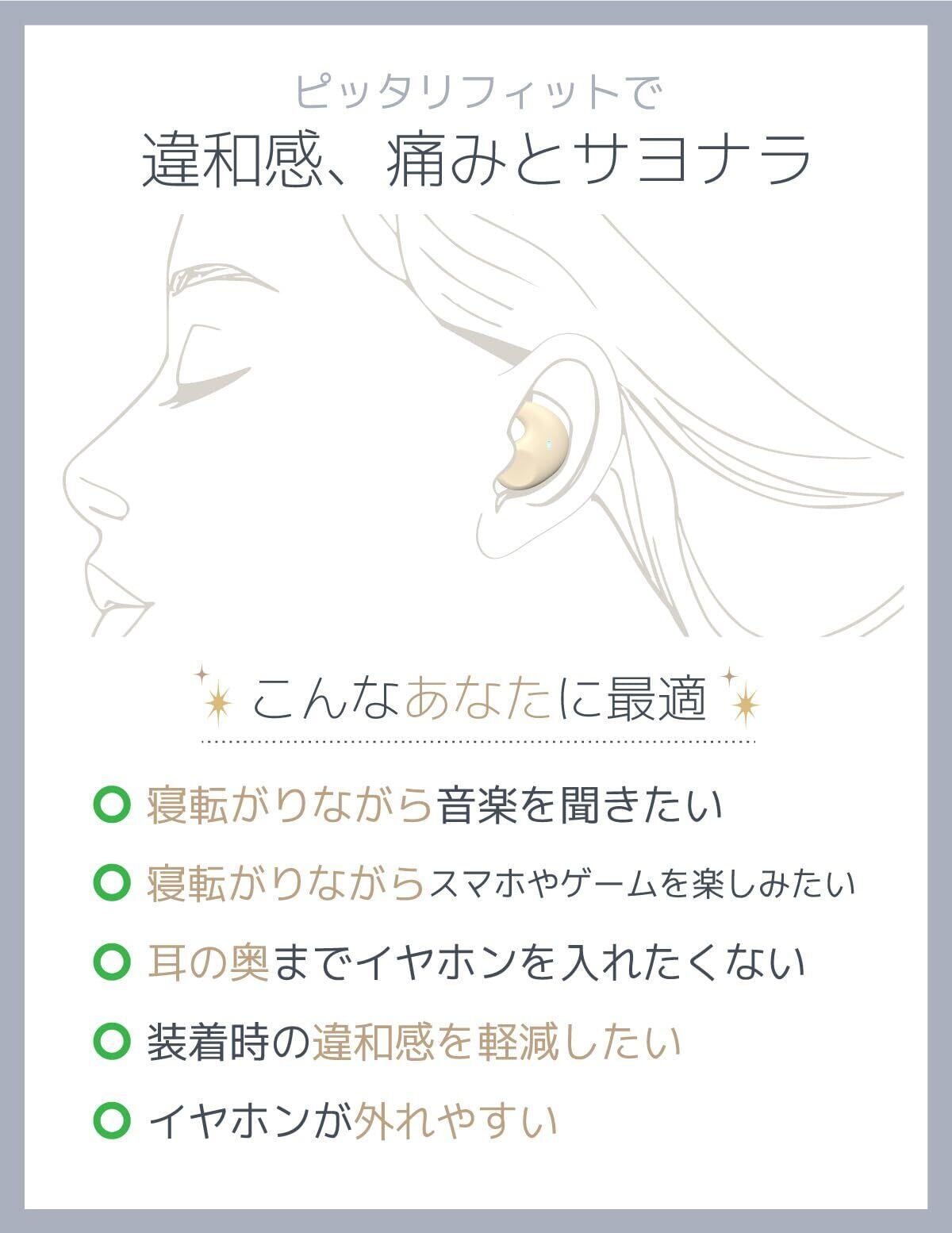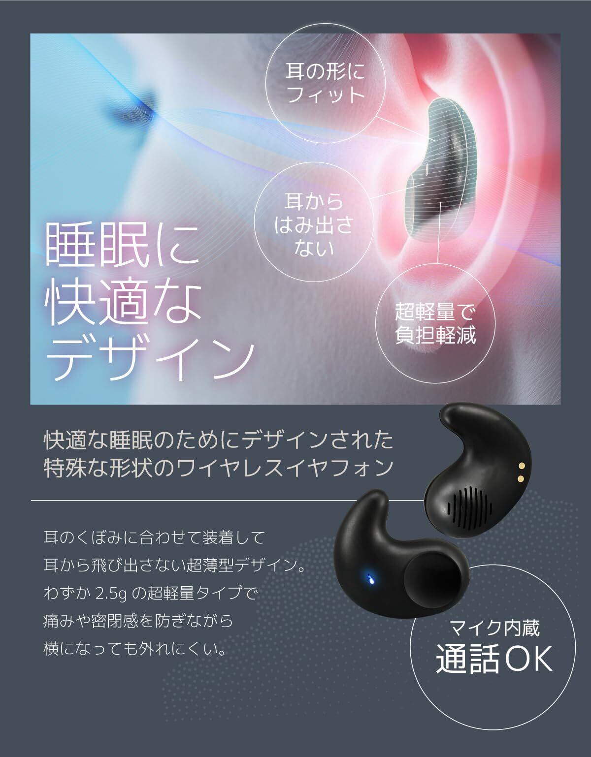 睡眠に快適なデザインで耳からはみ出さない寝ホンです。快適な睡眠のためにデザインされた、特殊な形状のワイヤレスイヤホン。超軽量で負担軽減。耳のくぼみに合わせて装着して耳から飛び出さない超薄型デザイン。 わずか 2.5g の超軽量タイプで痛みや密閉感を防ぎながら横になっても外れにくい。マイク内蔵。通話OKです。